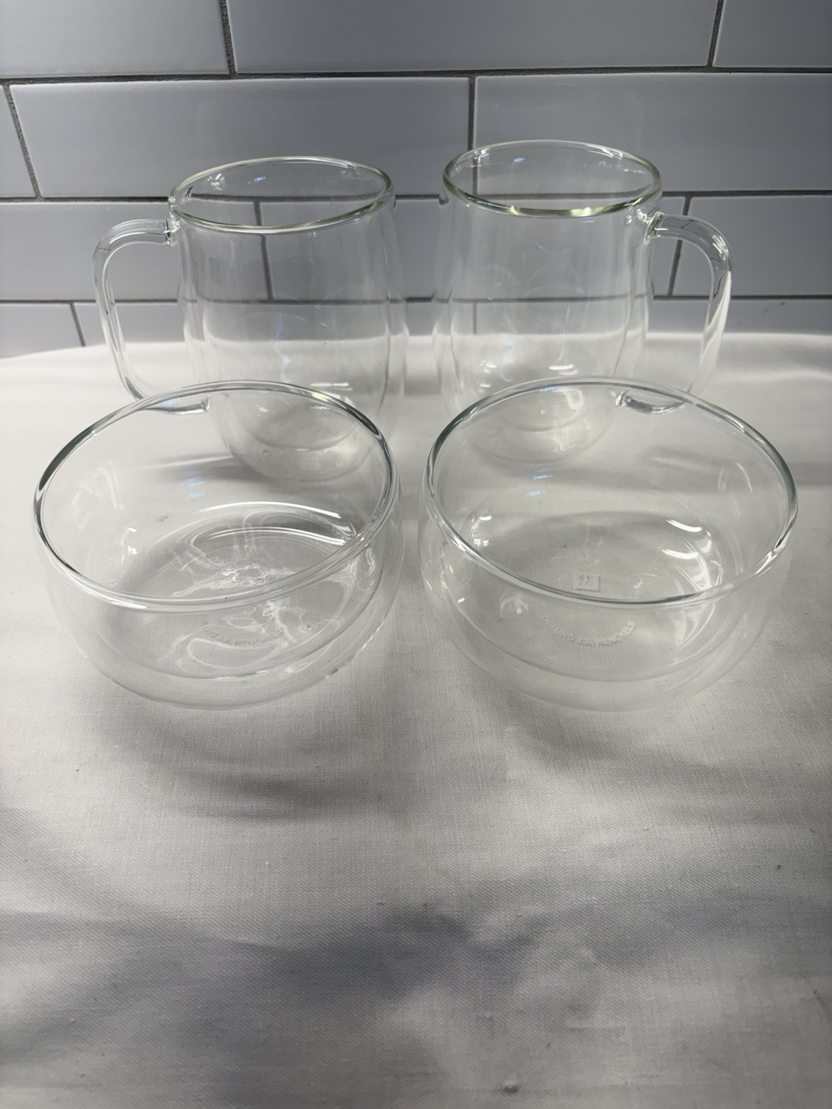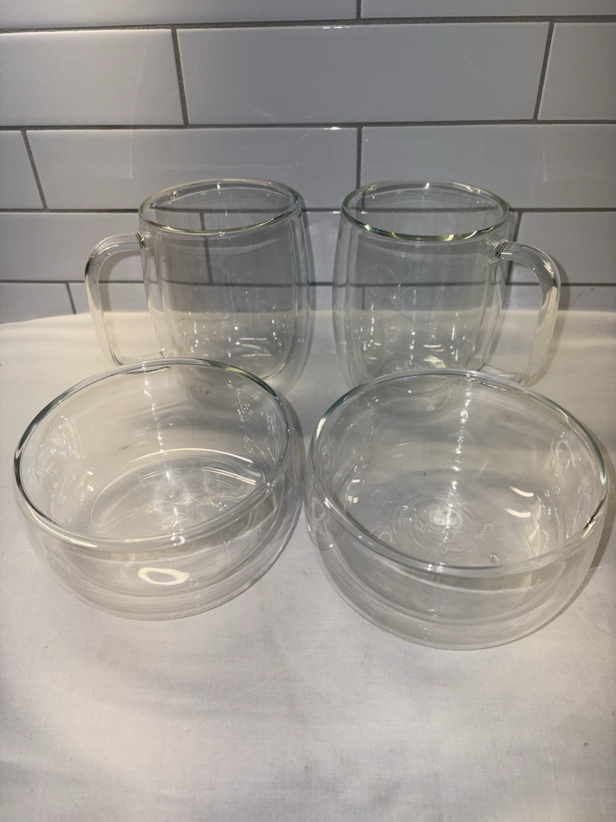 ZWILLING J.A. Henckels Double Wall Glass Sorrento Coffee Tea Clear Mugs and bowls Set Of 2 each. Excellent condition. Please see photos for dimensions. - Glass is mouth-blown according to a traditional method - Microwave safe- Dishwasher safe When enjoying a coffee or tea beverage, Sorrento enhances the experience by maintaining the ideal temperature. Made with high quality borosilicate glass, these coffee mugs keep contents hot while remaining cool to the touch. Plus, cold drinks stay cold longer with no condensation