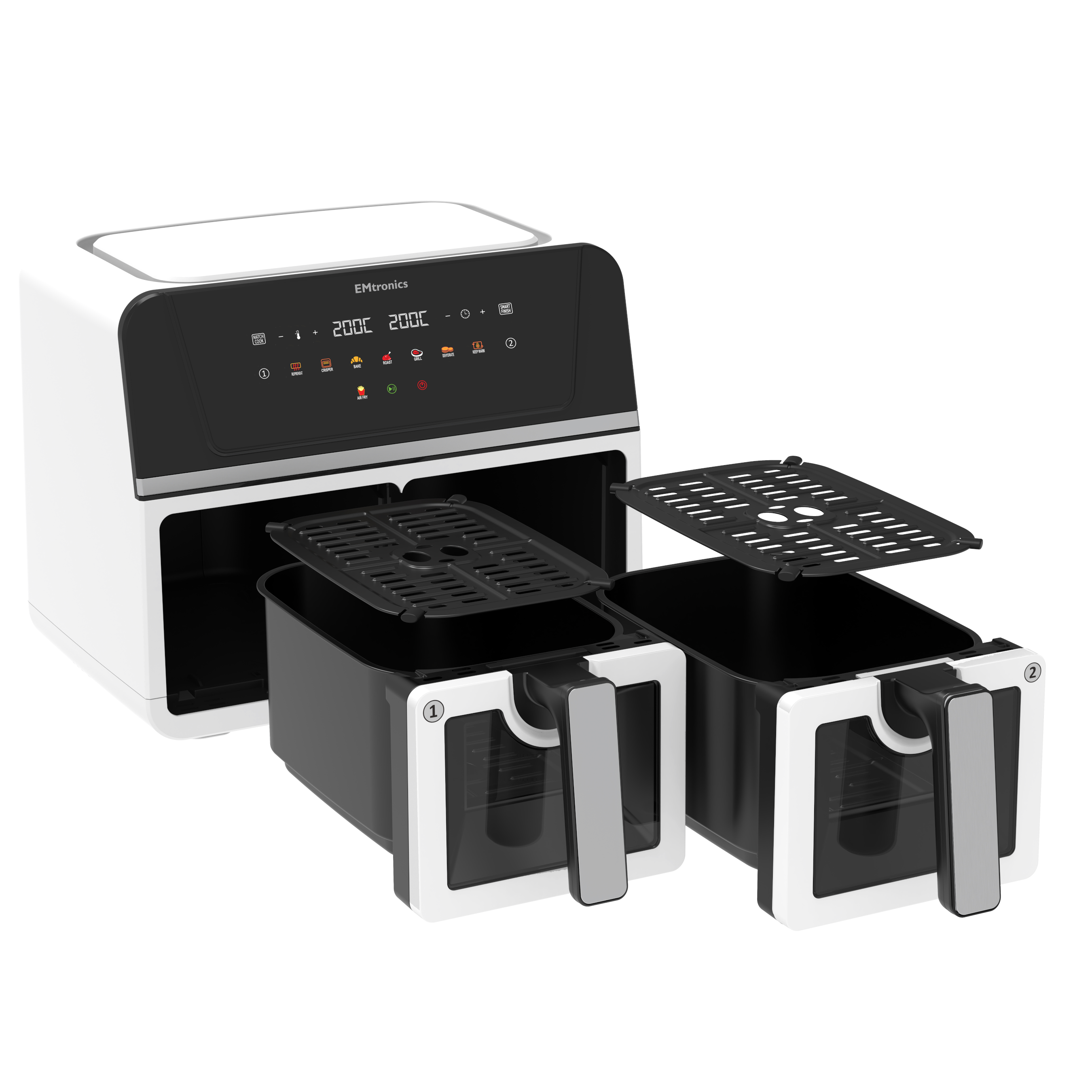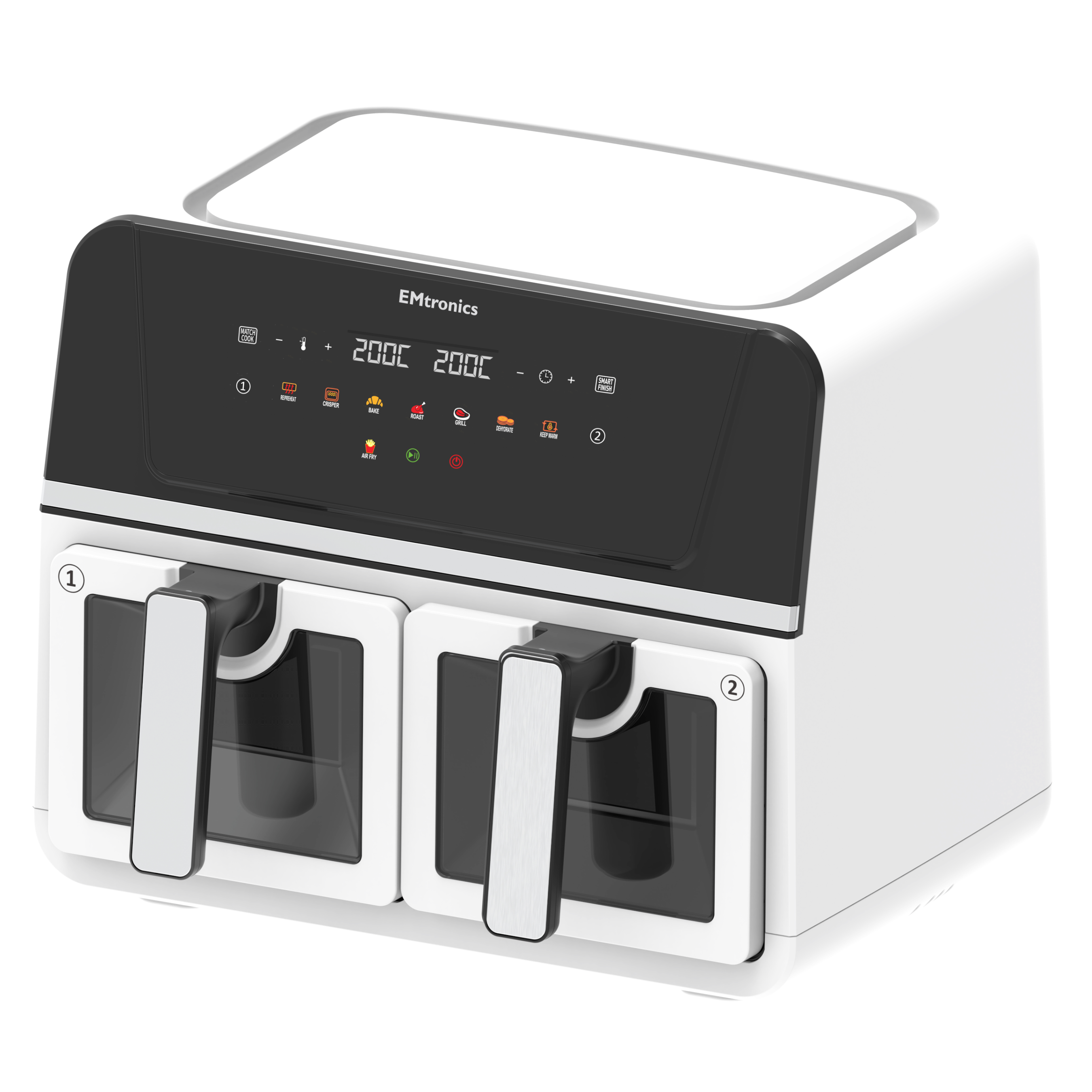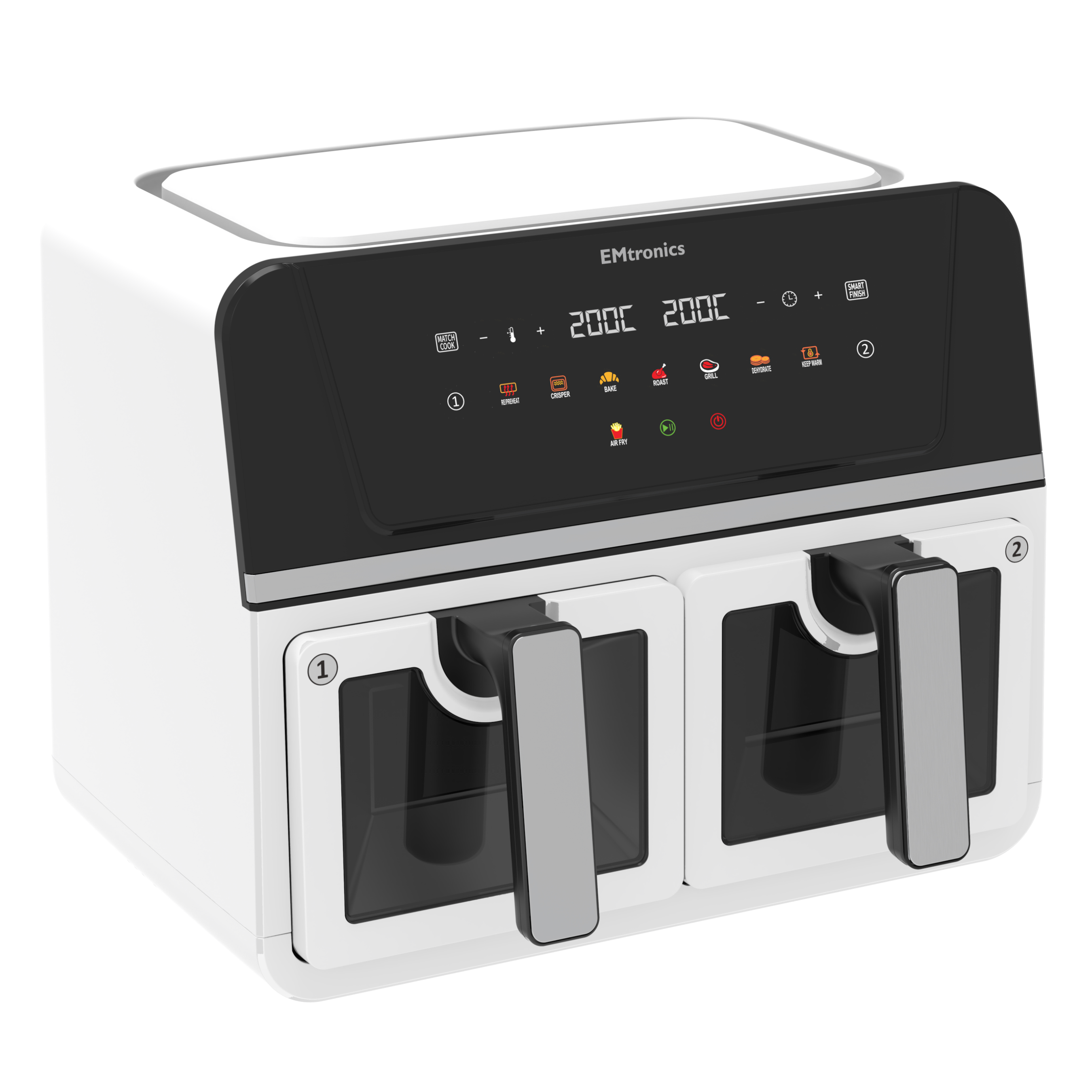 EMtronics 9 Litre Dual Basket Digital Air Fryer - Your Kitchen's New Essential! Revolutionize your cooking experience with the EMtronics 9 Litre Dual Basket Digital Air Fryer. Whether you're in the mood to air fry, preheat, dehydrate fruits for healthy snacks, bake a delicious cake, roast a tender joint, grill vibrant vegetables, achieve an ultimate crisper finish, or simply keep warm your culinary creations, the EMtronics Air Fryer has you covered.