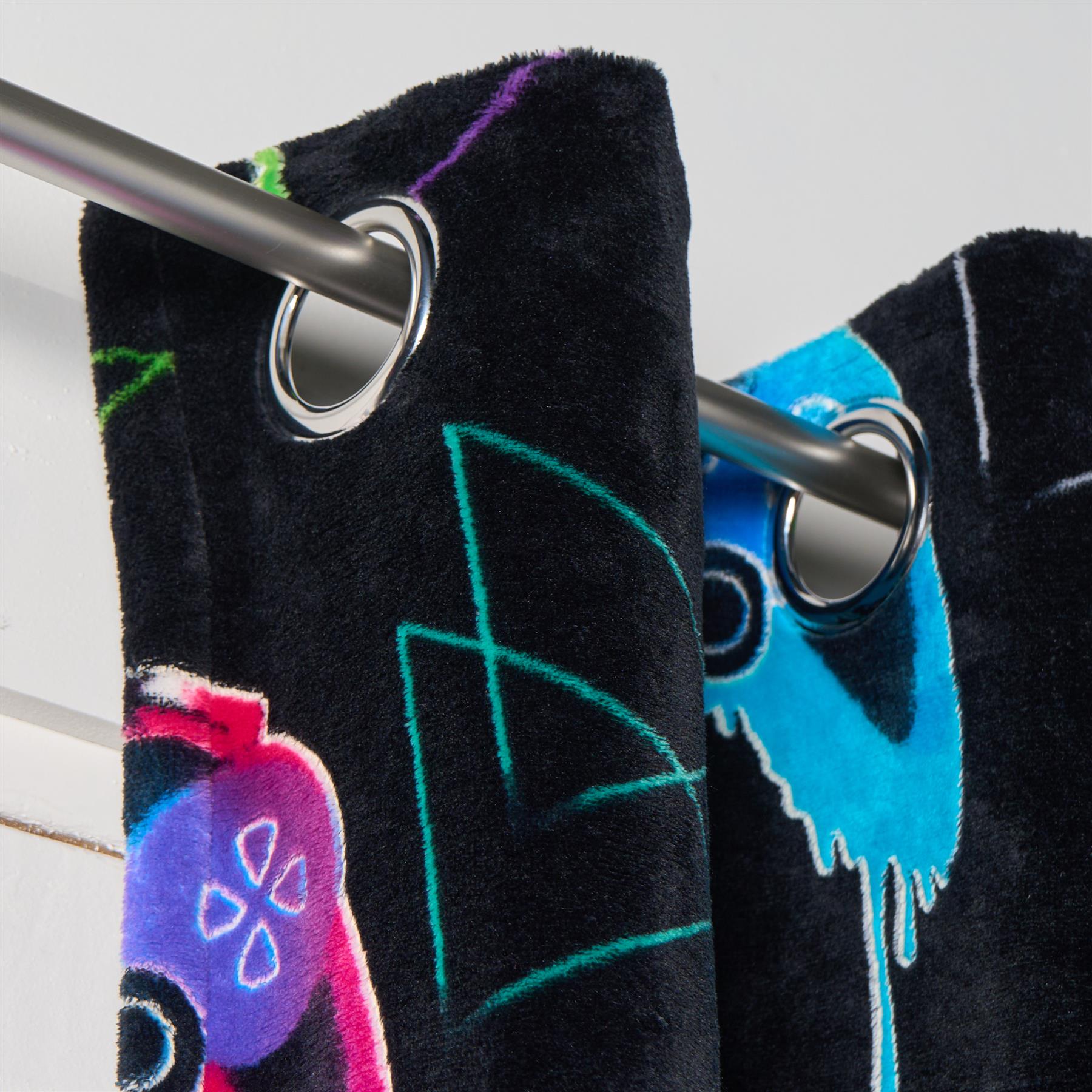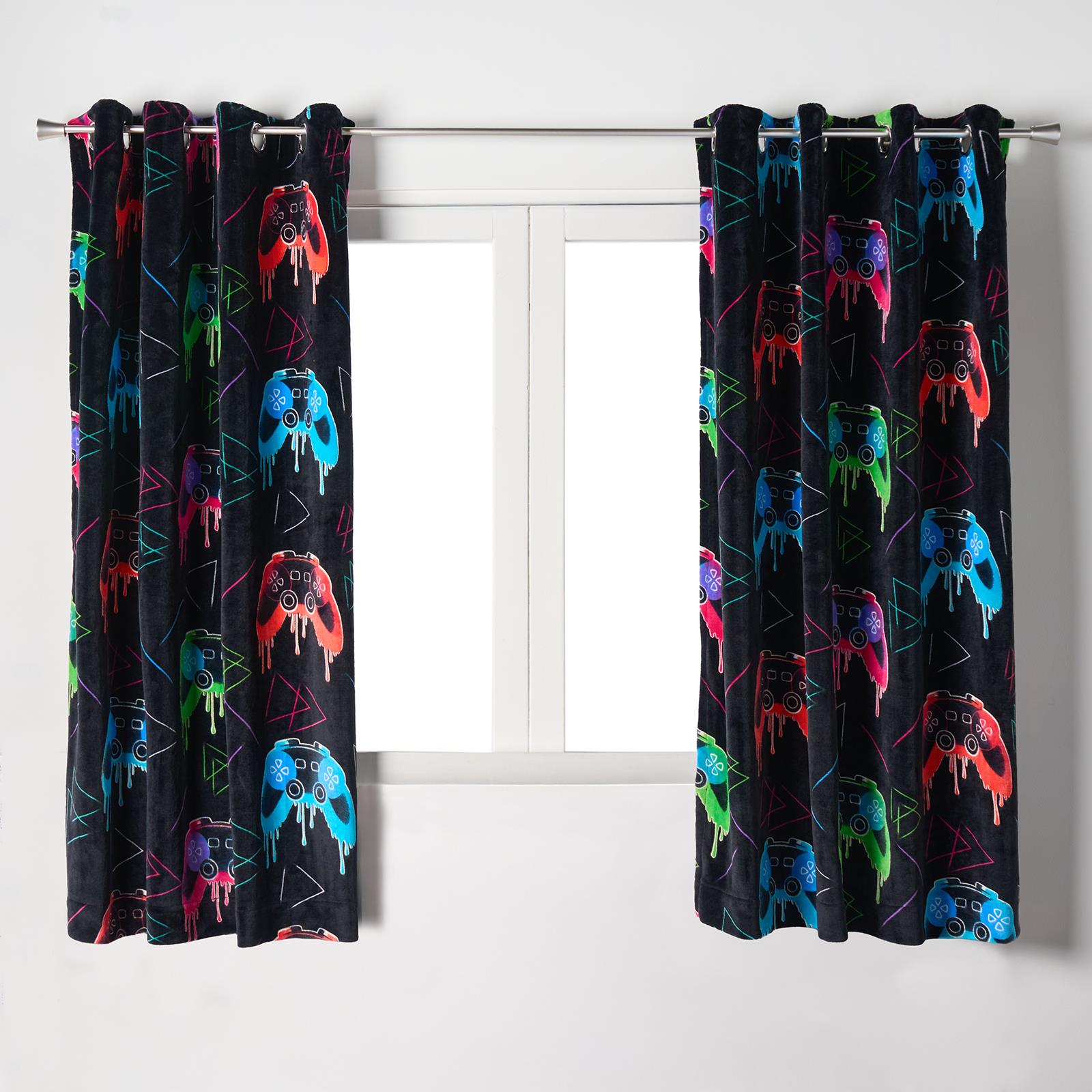 OHS Glow-in-the-Dark Kids Gaming Print Curtains in Black Size: 168 cm width x 183 cm drop Black 168 cm width x 183 cm drop