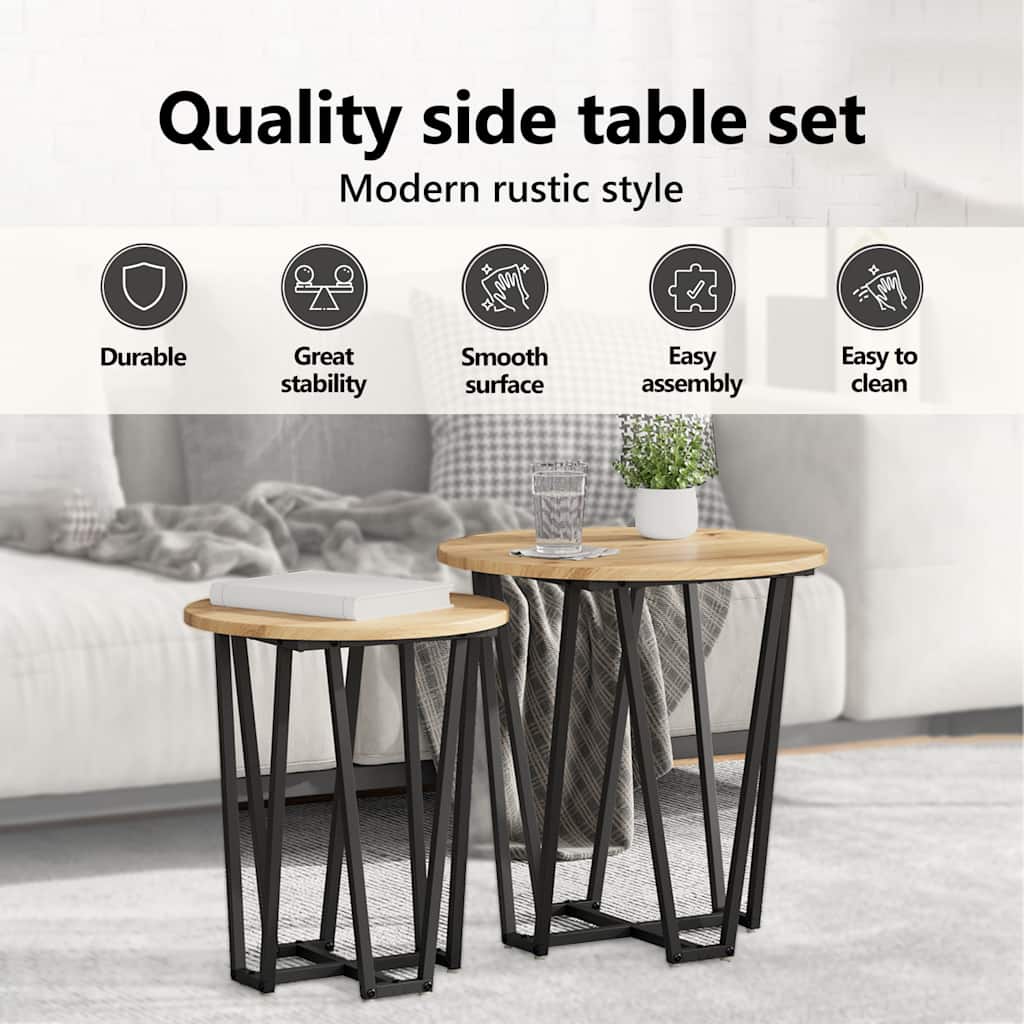 2Pc Round Nesting Stackable Sofa Side Bedside End Table Set Wood Top Metal Legs