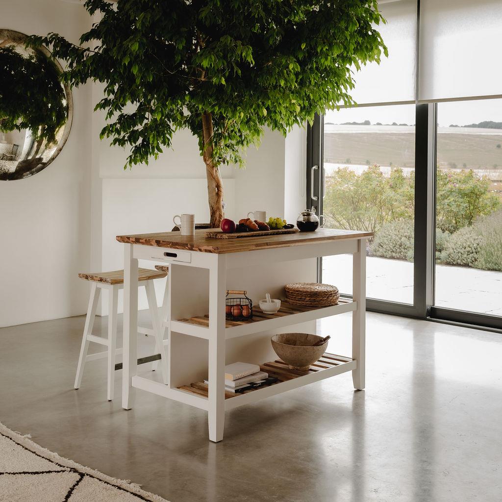 Florence Breakfast Bar with 2 large shelves. Small kitchen island with storage. It is also heat and stain-resistant. The Florence breakfast bar is available inWhite, Dove Grey, Truffle, Sage Green andNavy Blue.