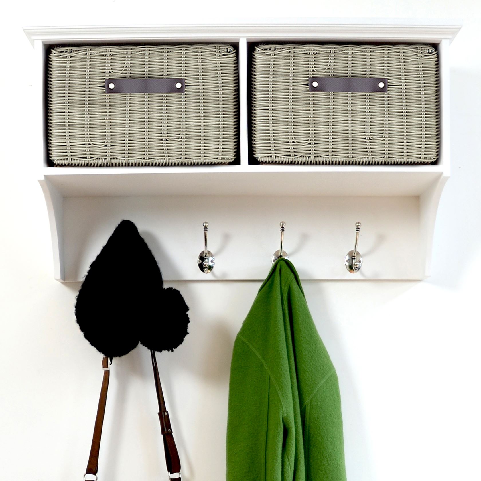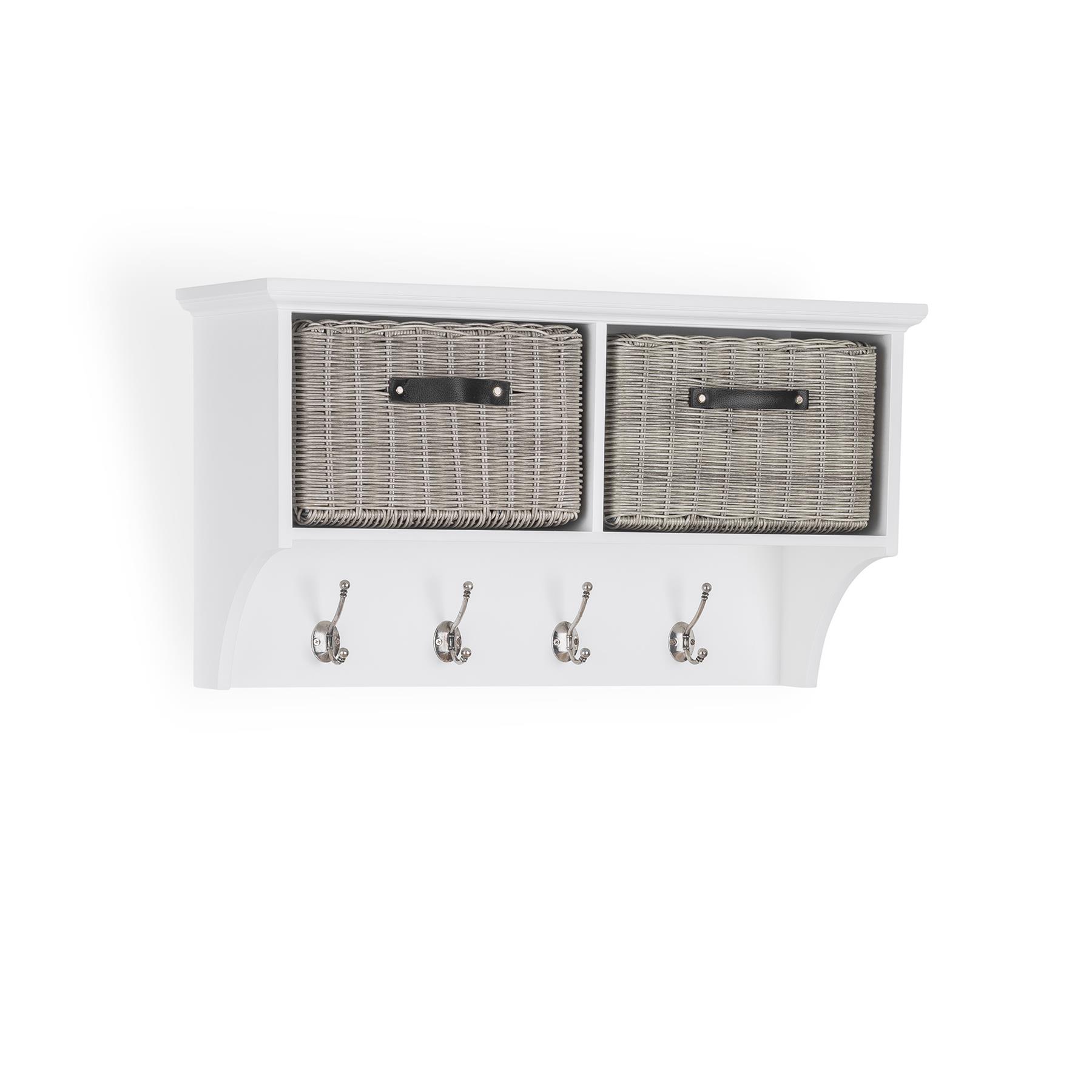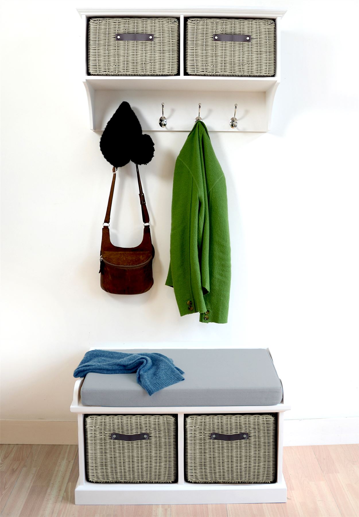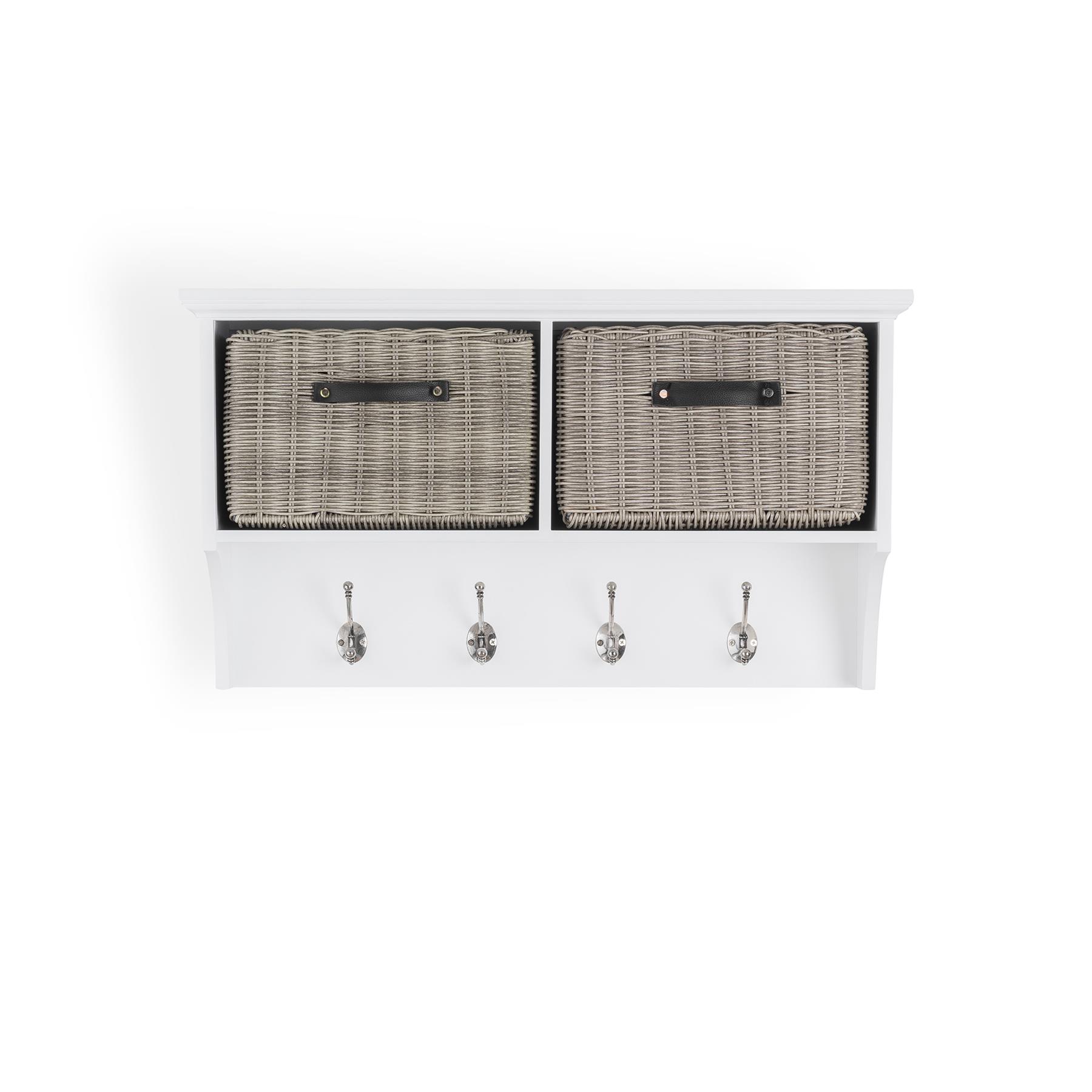 Beautiful Tetbury bench featuring two sturdy faux rattan baskets and a cushion. Unlike many other baskets on the market, these look very attractive too, with the appearance of real wicker. Features : extra strong wipe-clean baskets, leather handles, removable cushion cover.