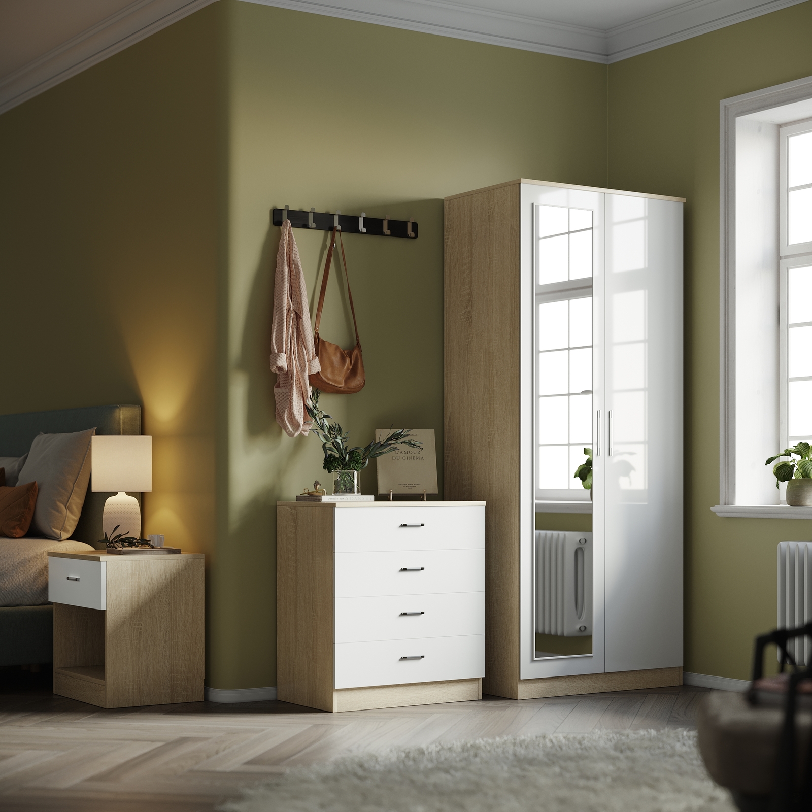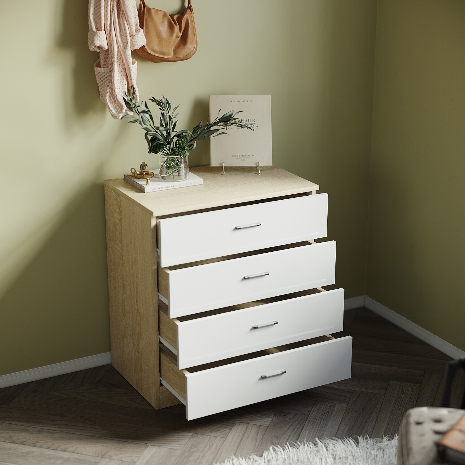 Modern High Gloss Chest of 4 Drawers White&Oak Storage Cabinet Bedroom Furniture