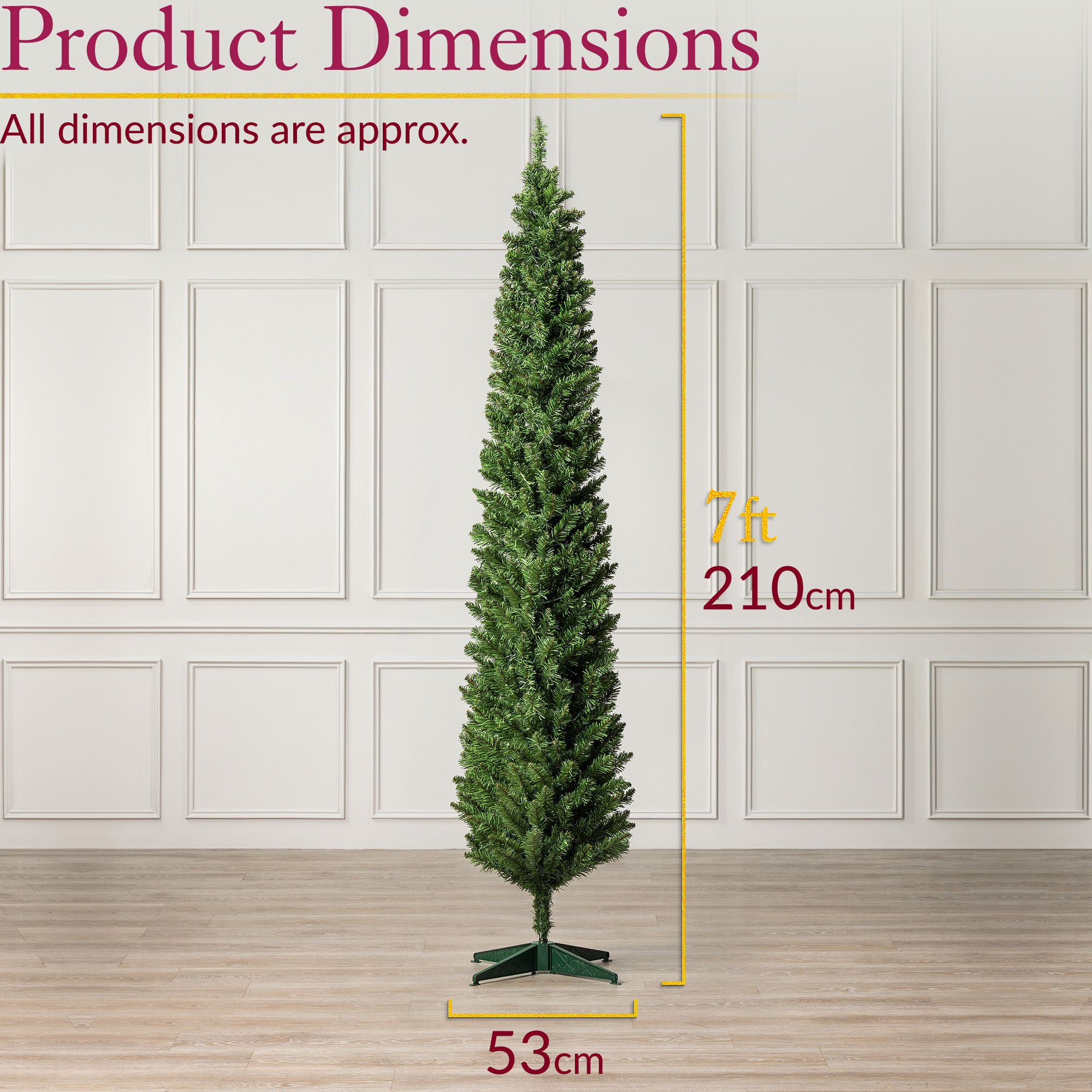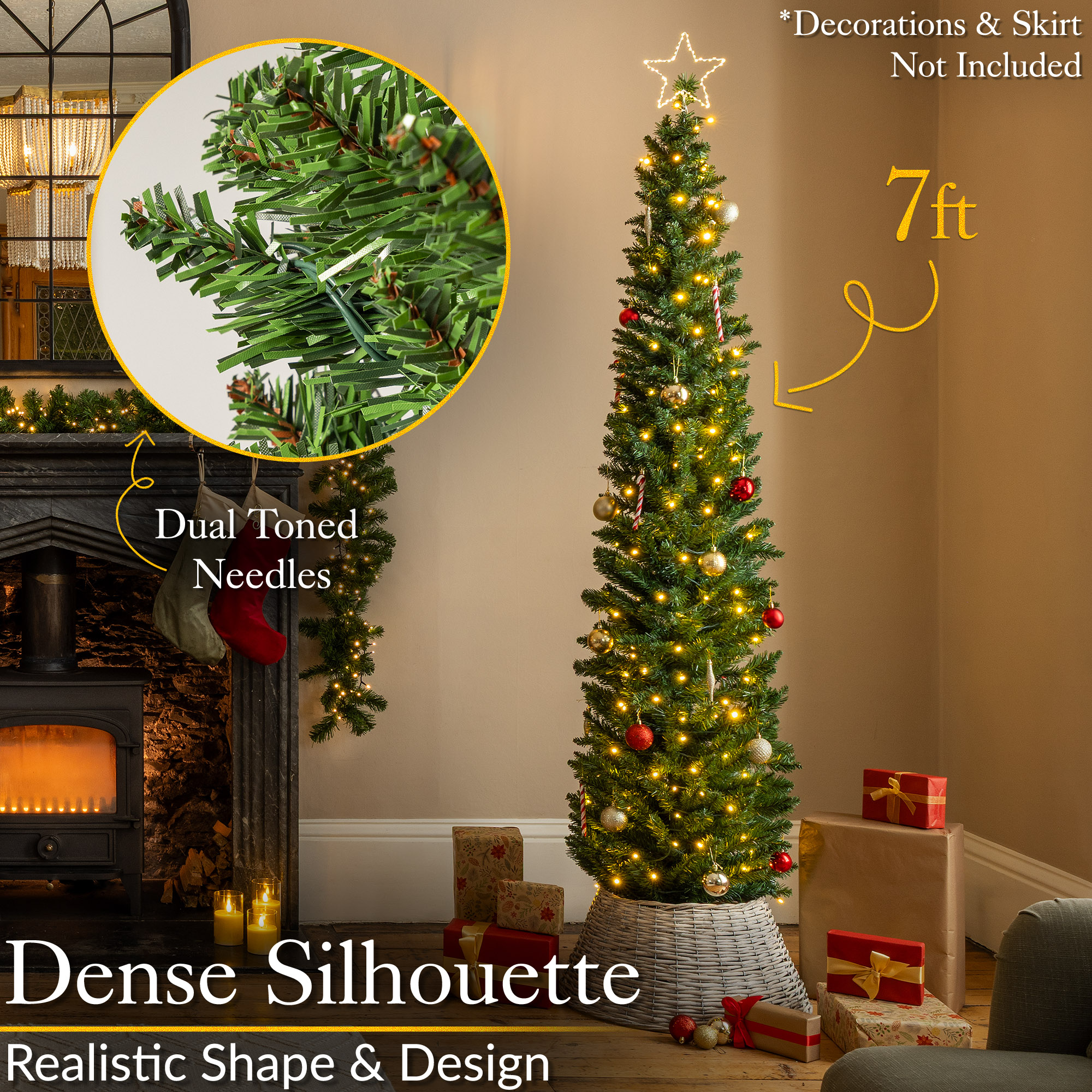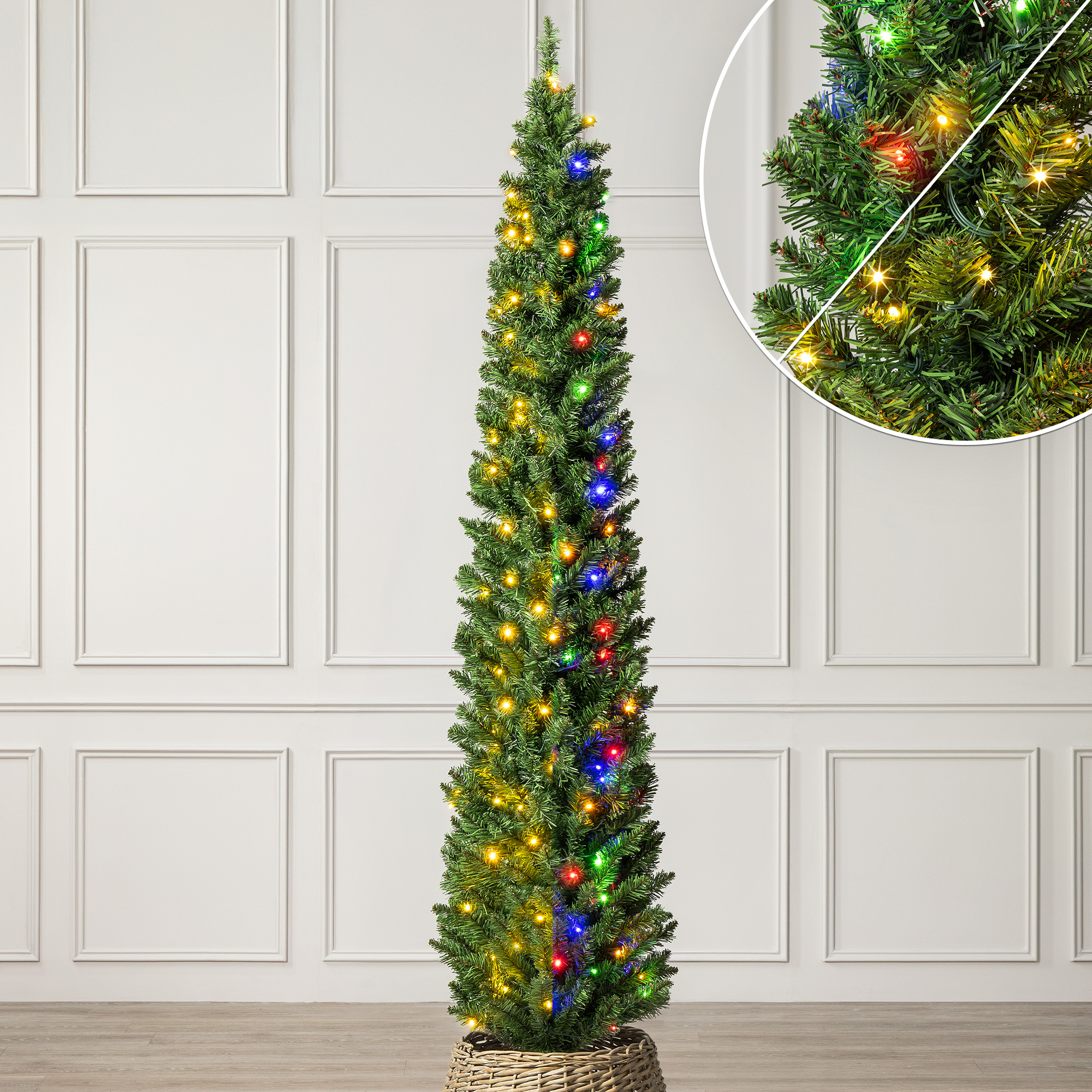Pre-Lit Aspen Spruce Pencil Christmas Tree available in 5ft, 6ft, and 7ft sizes. Designed with a slim, compact shape, it’s perfect for small rooms, narrow hallways, and cosy corners. Pre-wrapped with LEDs for a quick, easy setup, it also features a colour switch and five light effects to bring your festive display to life.