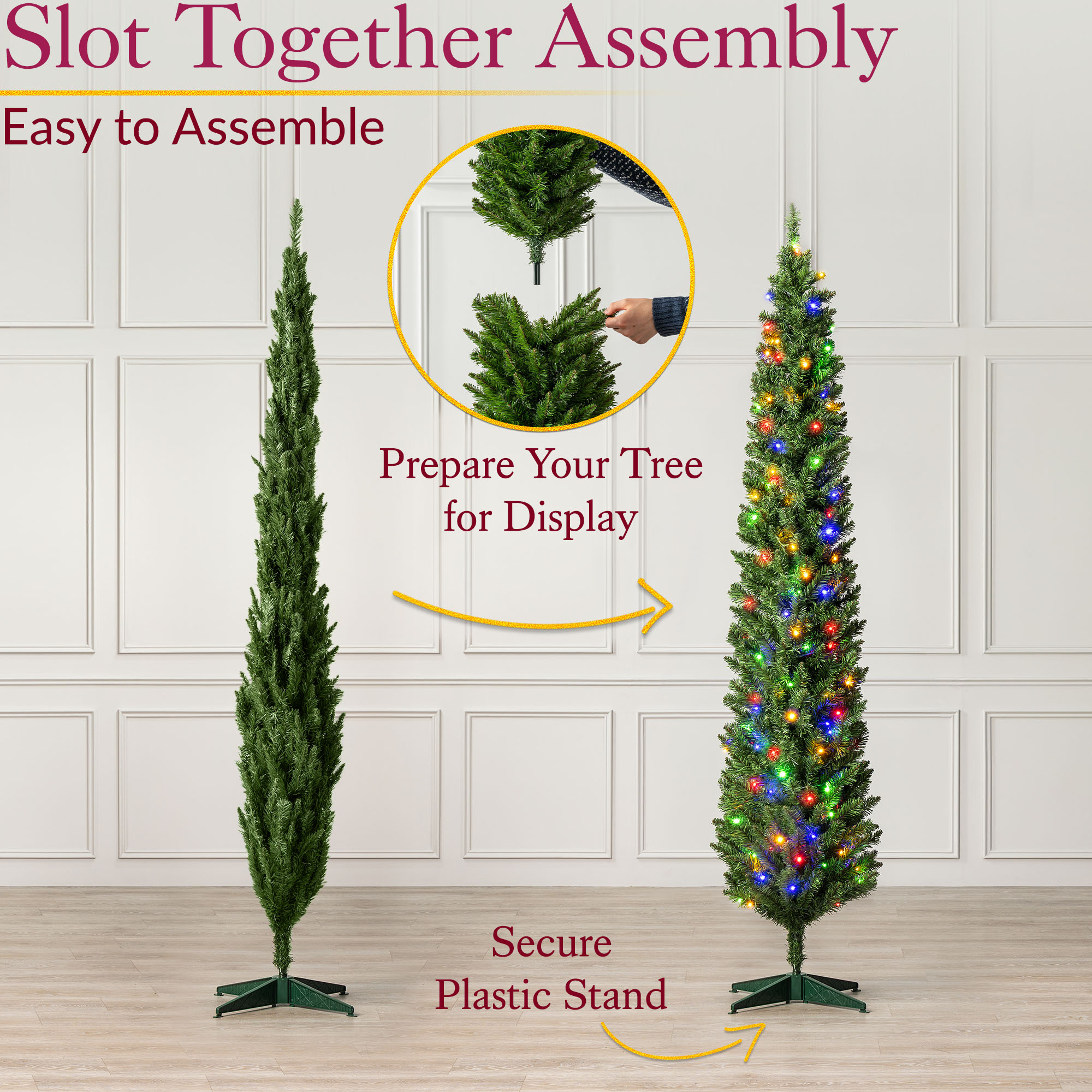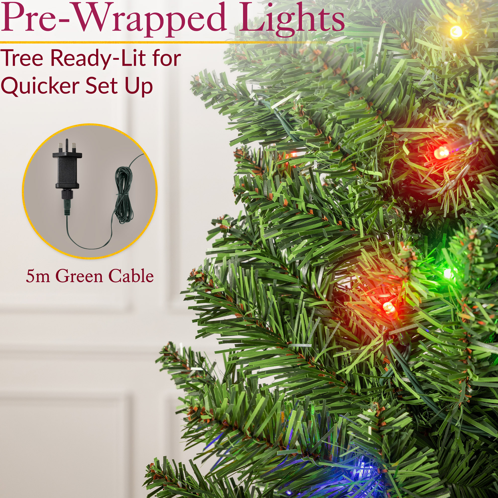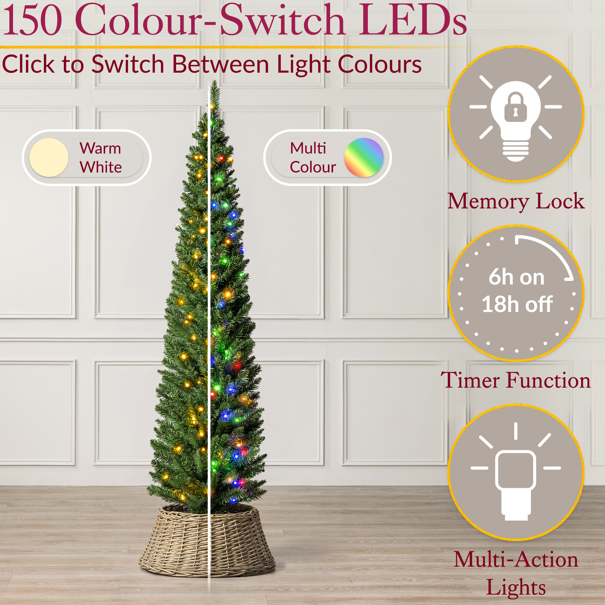 Pre-Lit Aspen Spruce Pencil Christmas Tree available in 5ft, 6ft, and 7ft sizes. Designed with a slim, compact shape, it’s perfect for small rooms, narrow hallways, and cosy corners. Pre-wrapped with LEDs for a quick, easy setup, it also features a colour switch and five light effects to bring your festive display to life.