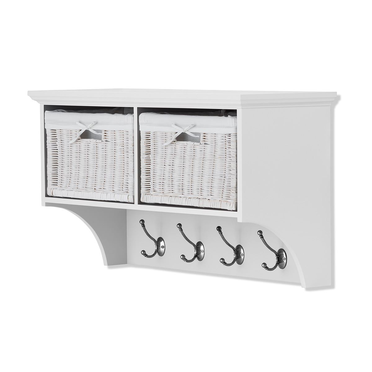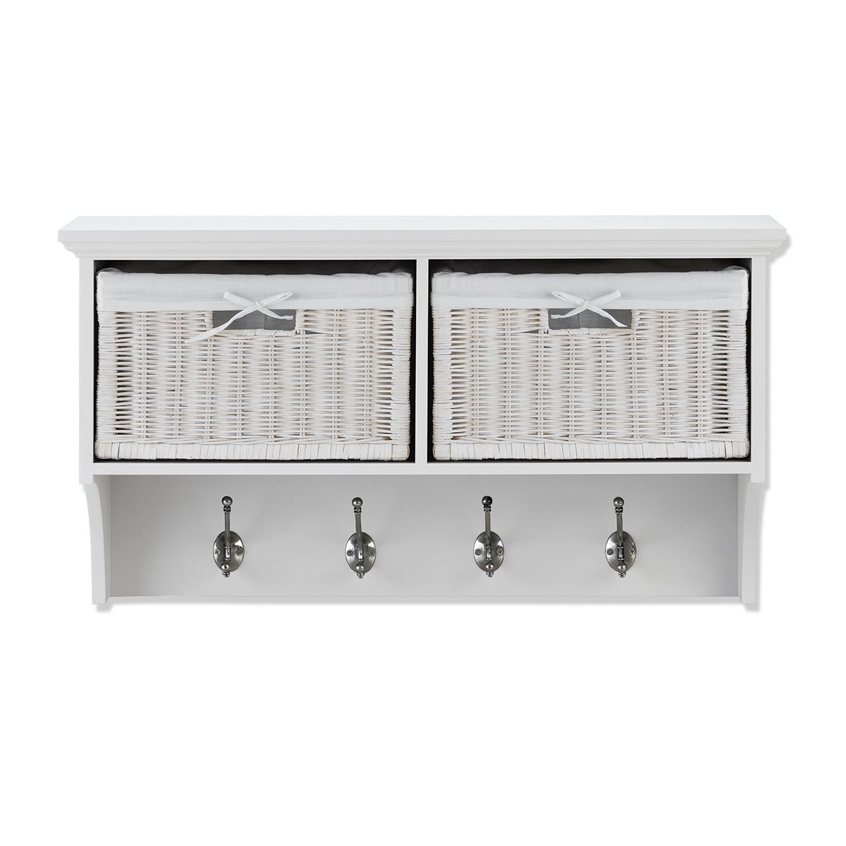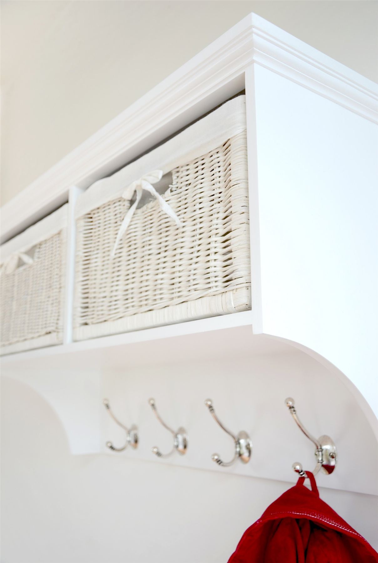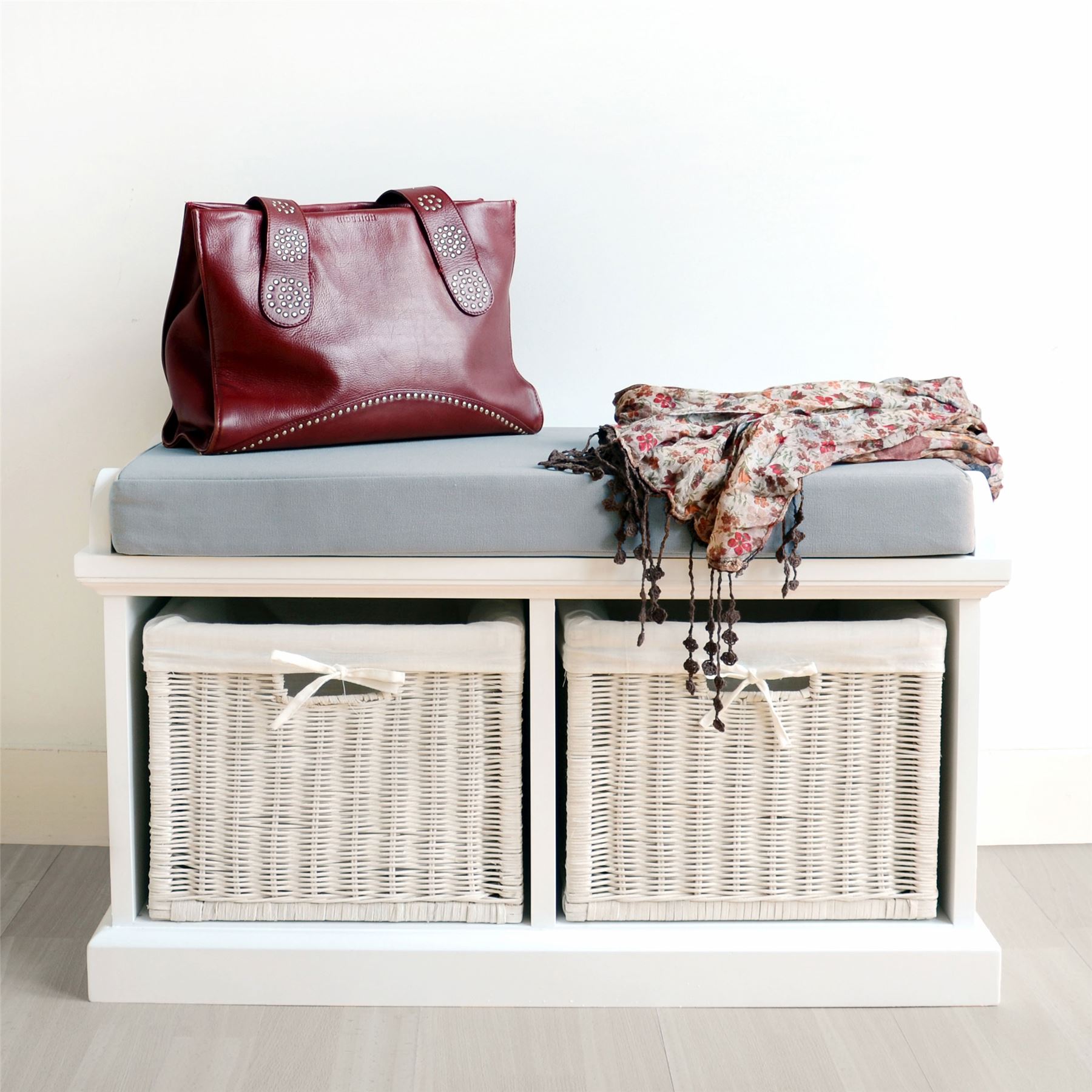 Tetbury white storage bench and hanging shelf with wipe clean baskets.QUALITY