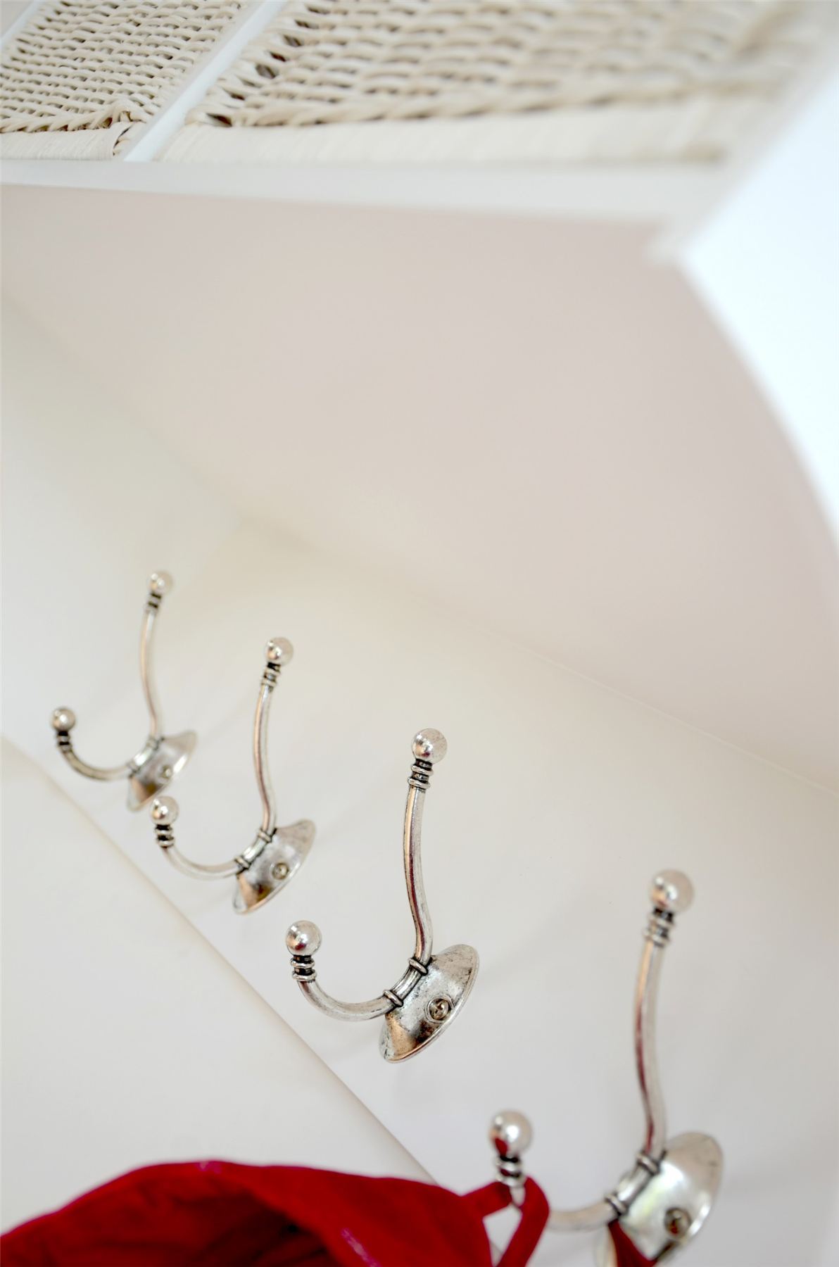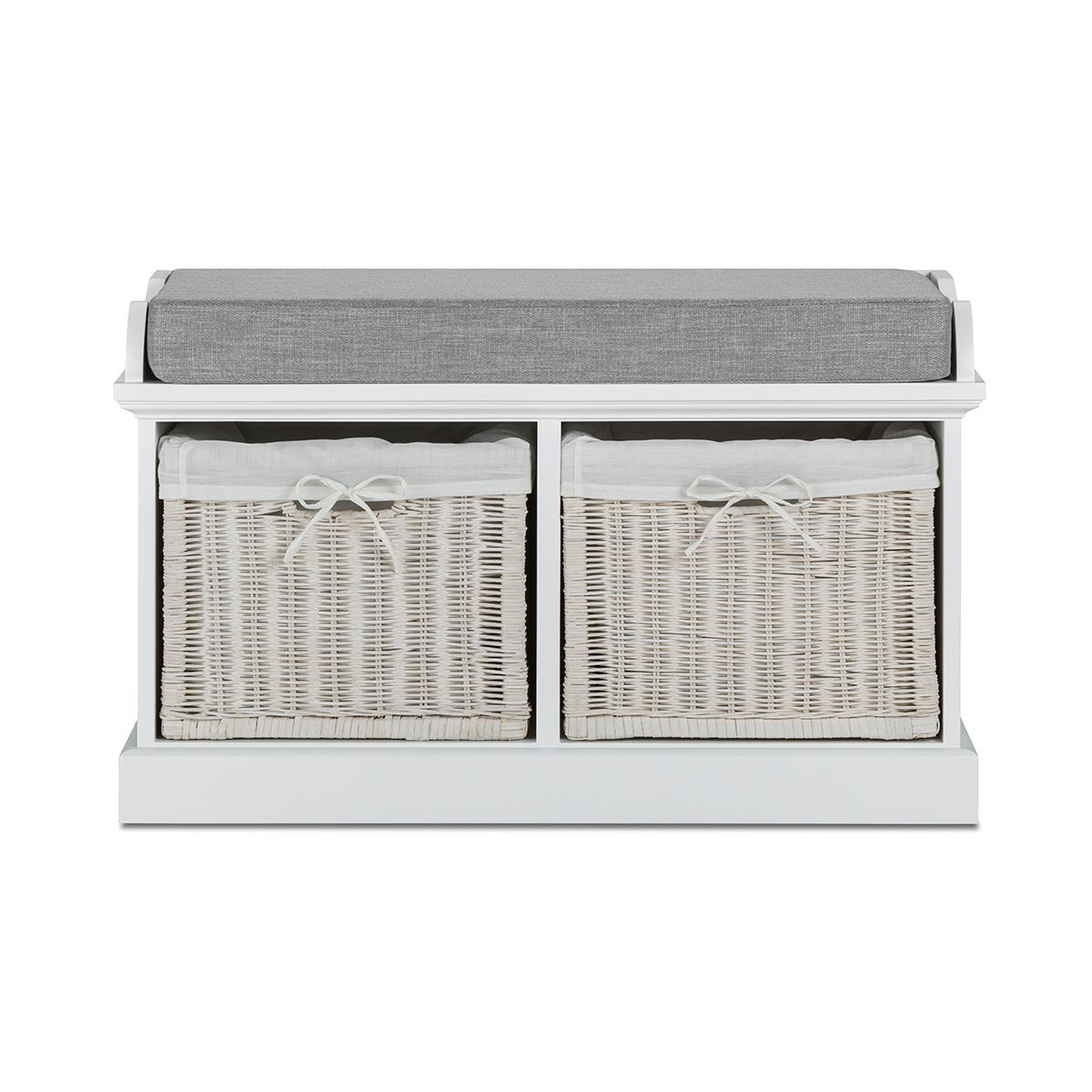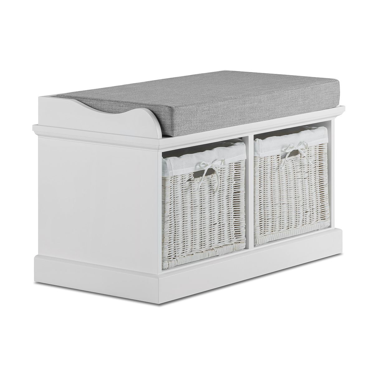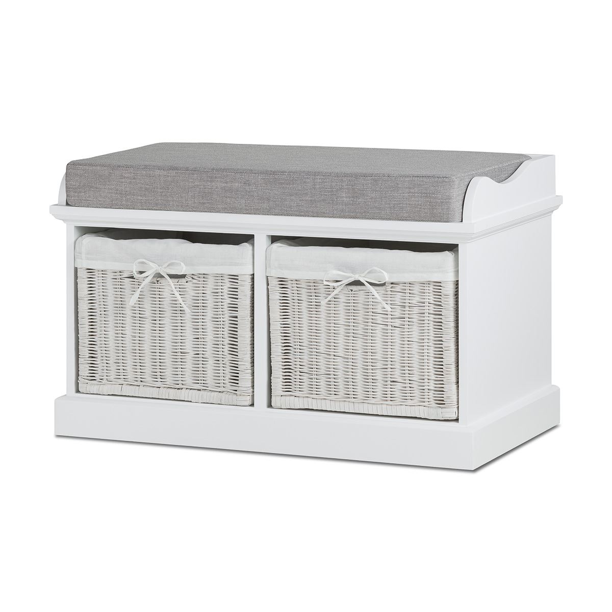 Tetbury white storage bench and hanging shelf with wipe clean baskets.QUALITY