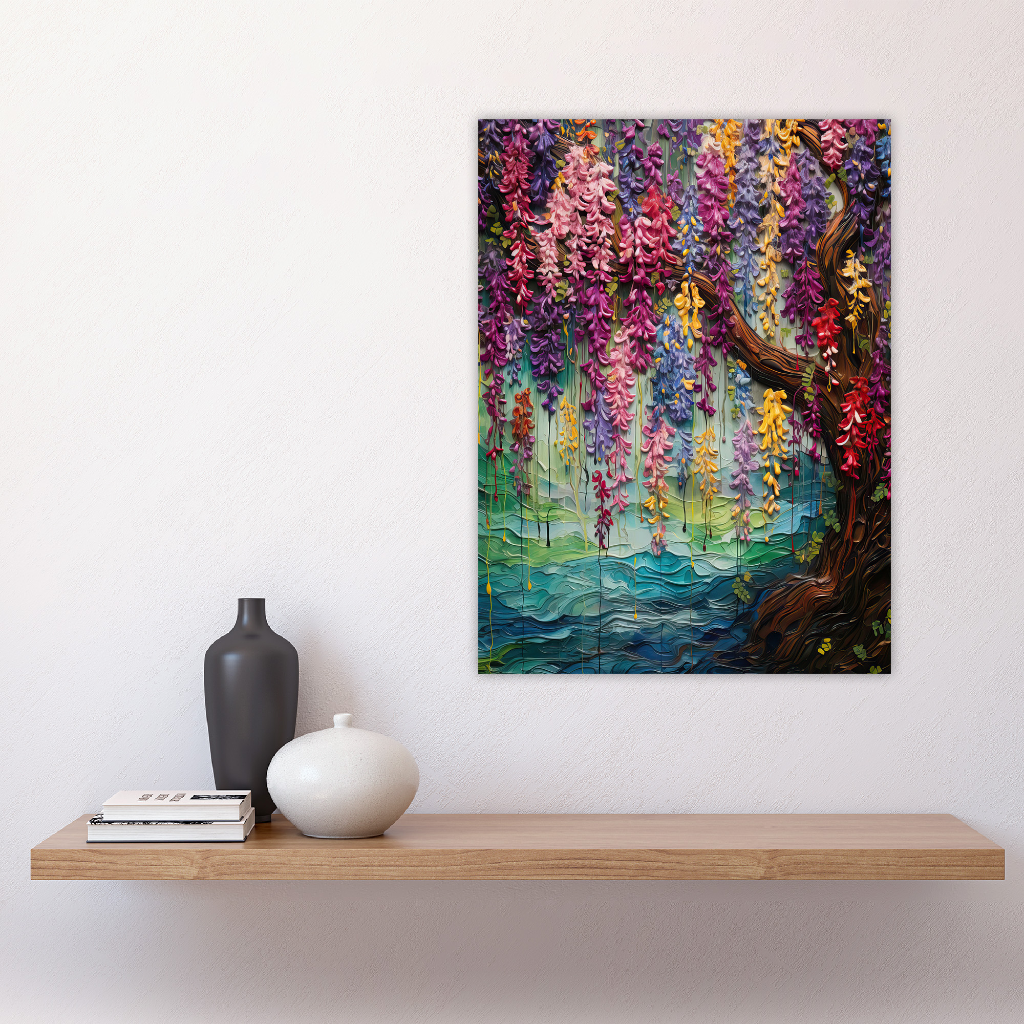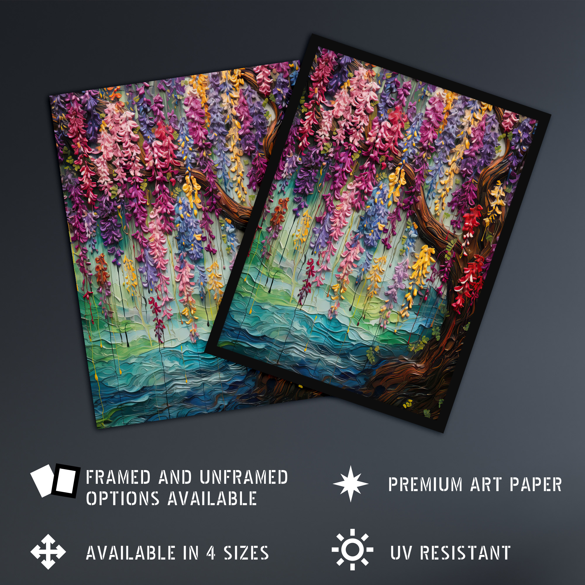 Artery8 Wall Art Print Colourful Cascading Wisteria Over Riverbank Heavy Oil Painting Art Framed in Black Size: W12" x H16" Black W12" x H16"