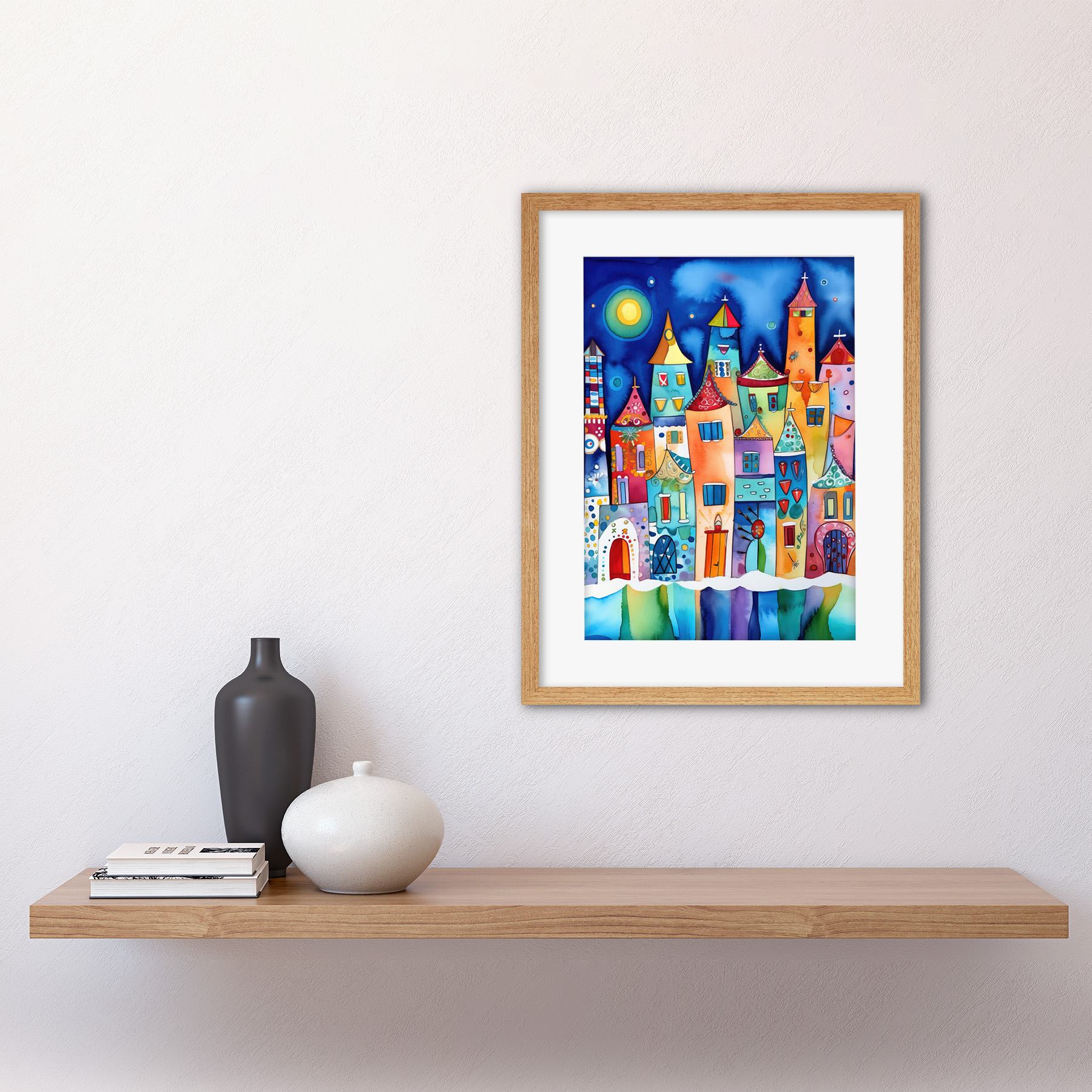 Midnight Abstract Town Modern Folk Art Framed Wall Art Picture Print A4