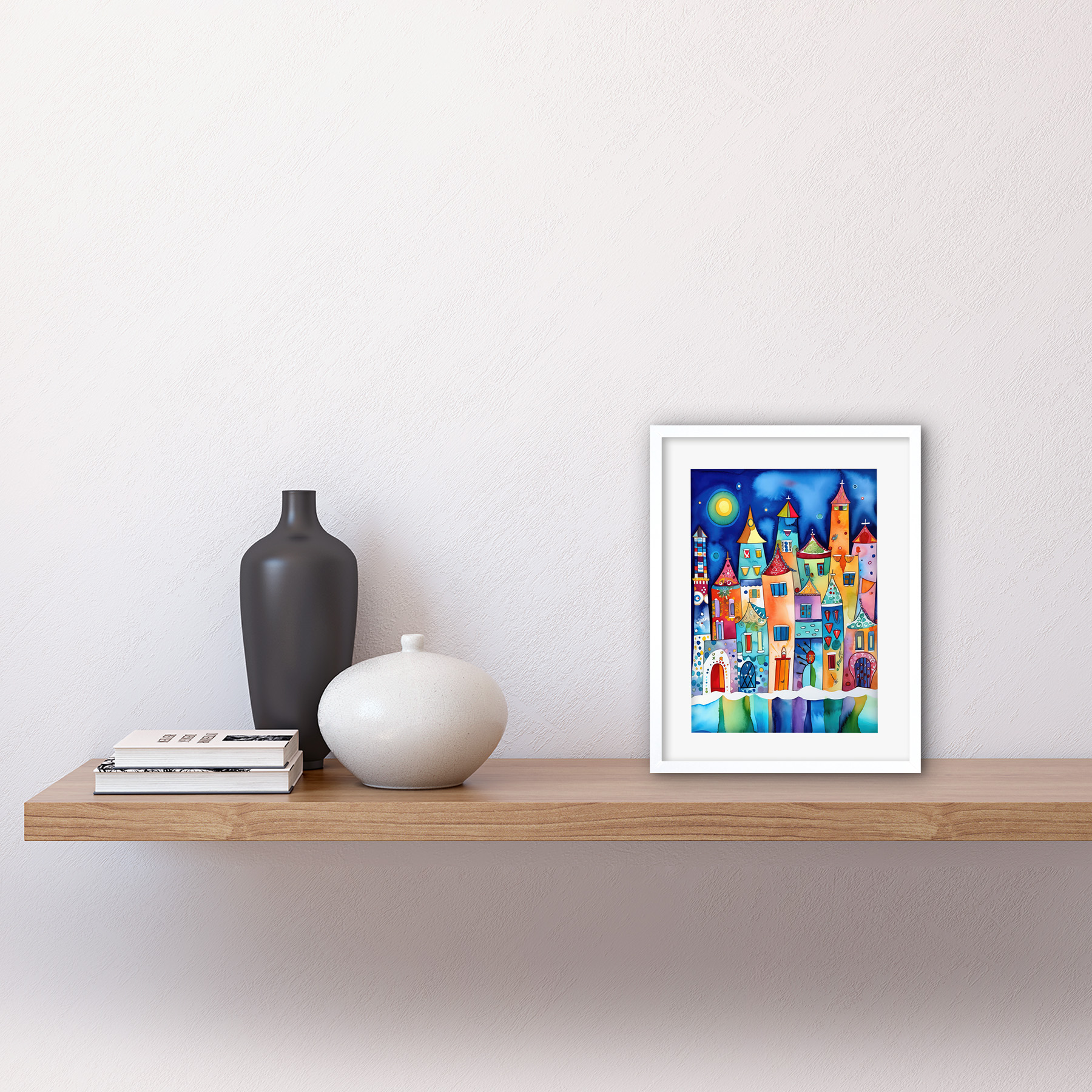 Midnight Abstract Town Modern Folk Art Framed Wall Art Picture Print A4