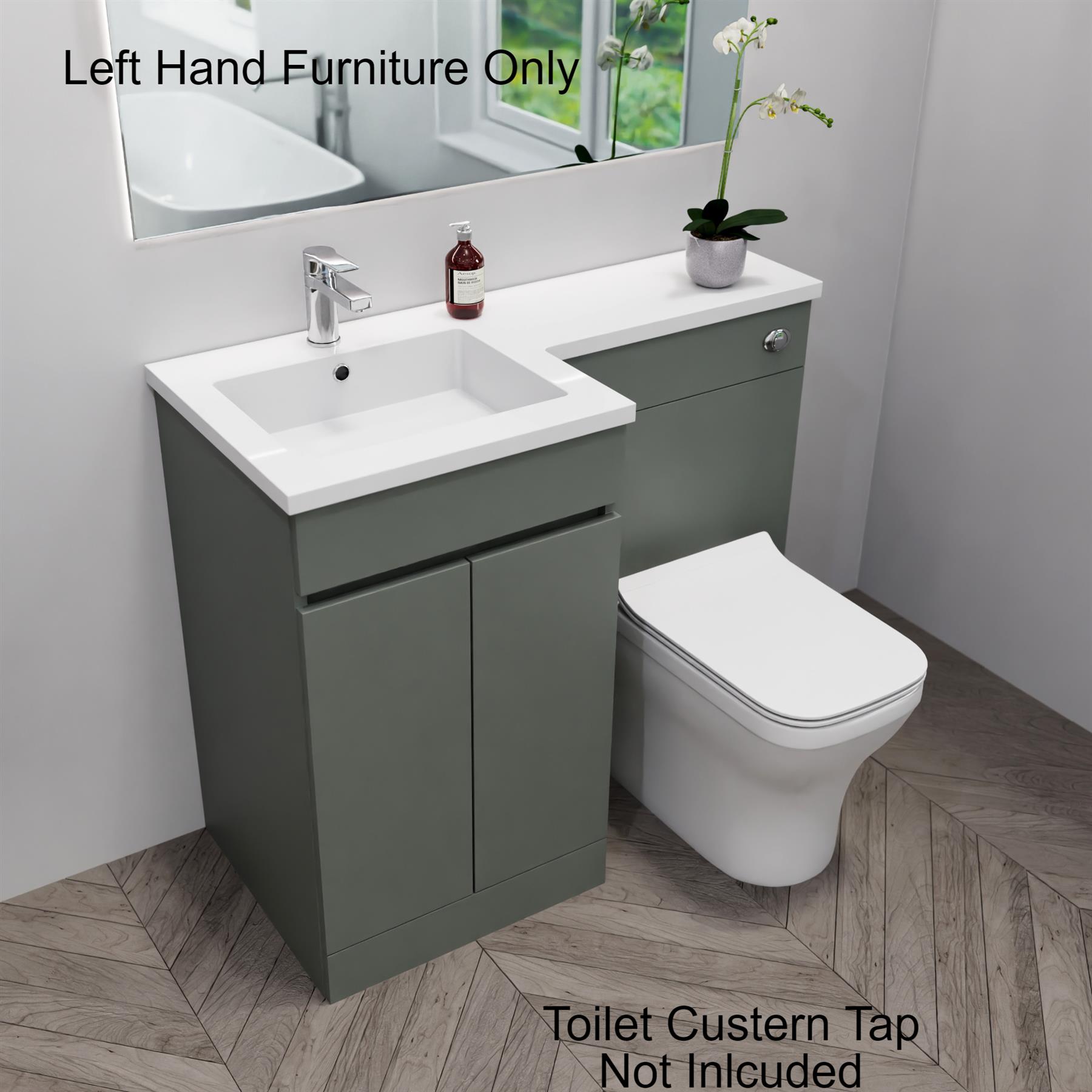Width: 1100mm. Vanity Combination Basin Unit. Back to Wall Toilet Unit. 1 Tap Hole Glazed Cramic Basin. Finished In Reed Green. 600mm Vanity Unit & 500mm WC Unit. Depth: 450mm. Plenty Of Storage Space.