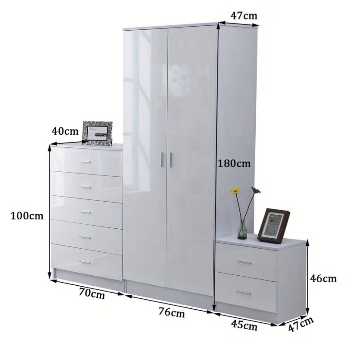 High Gloss 3 Piece Trio Bedroom Furniture Set Wardrobe + Chest Of Drawer + Bedsi