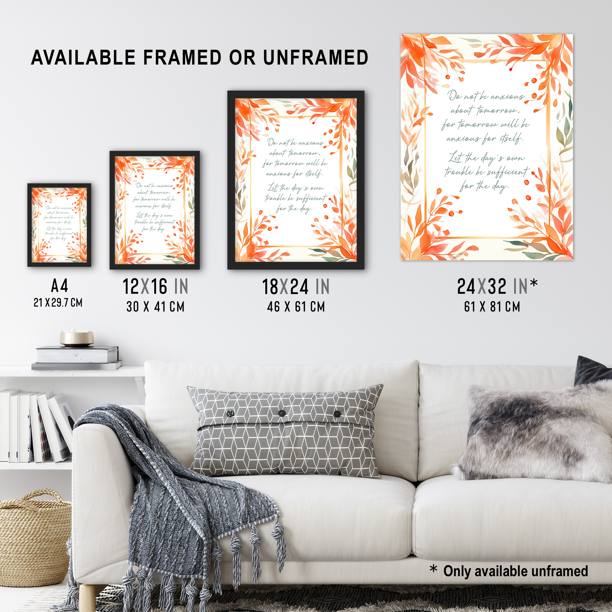 Artery8 Wall Art Print Matthew 6:34 Live in the Moment Jesus Bible Quote Orange Framed Art Size: A4 Orange A4