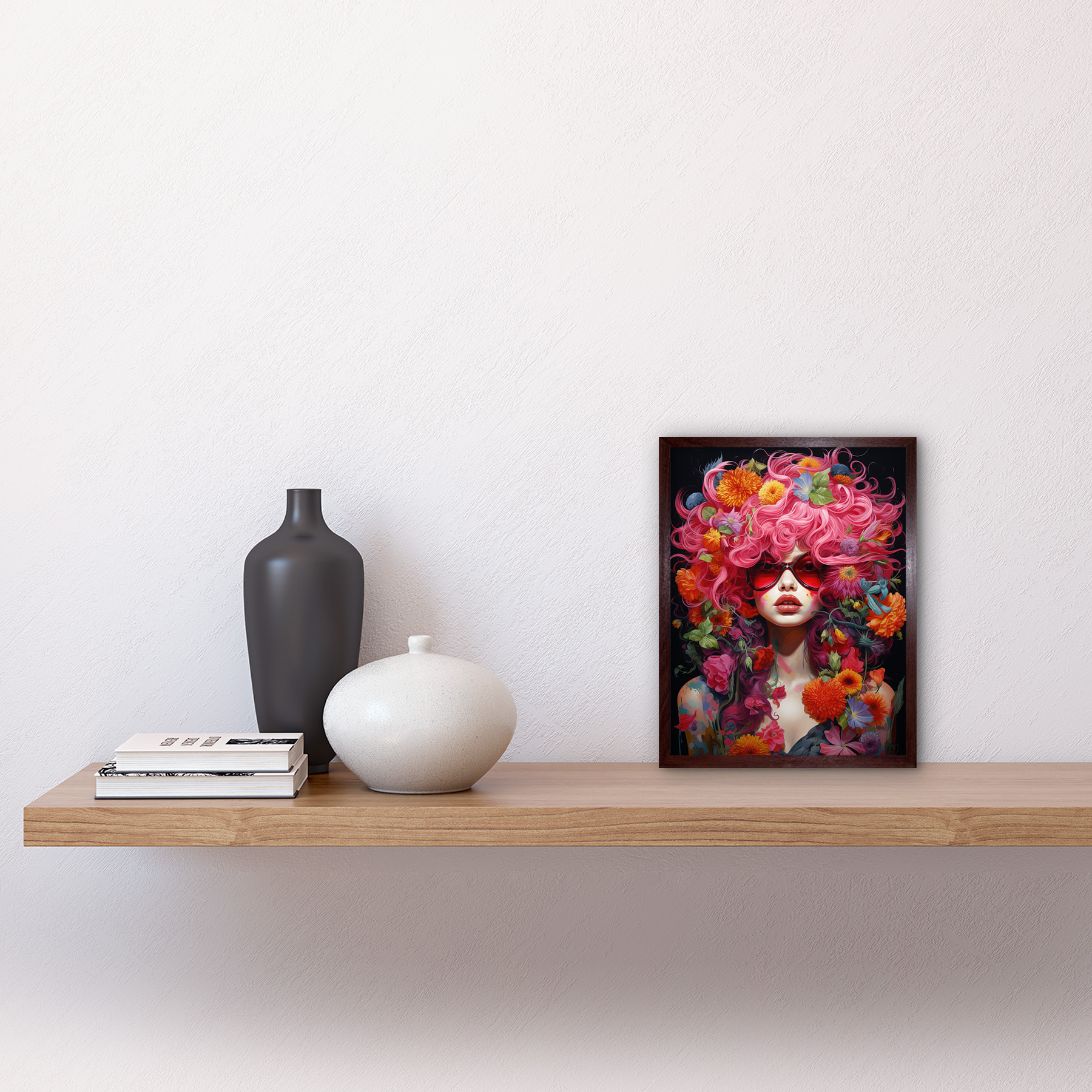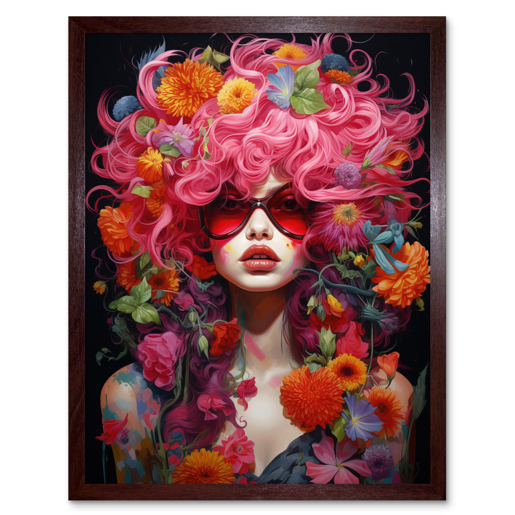 Flowerpunk Woman with Pink Hair and Flowers Vibrant Framed Wall Art Print 9X7"