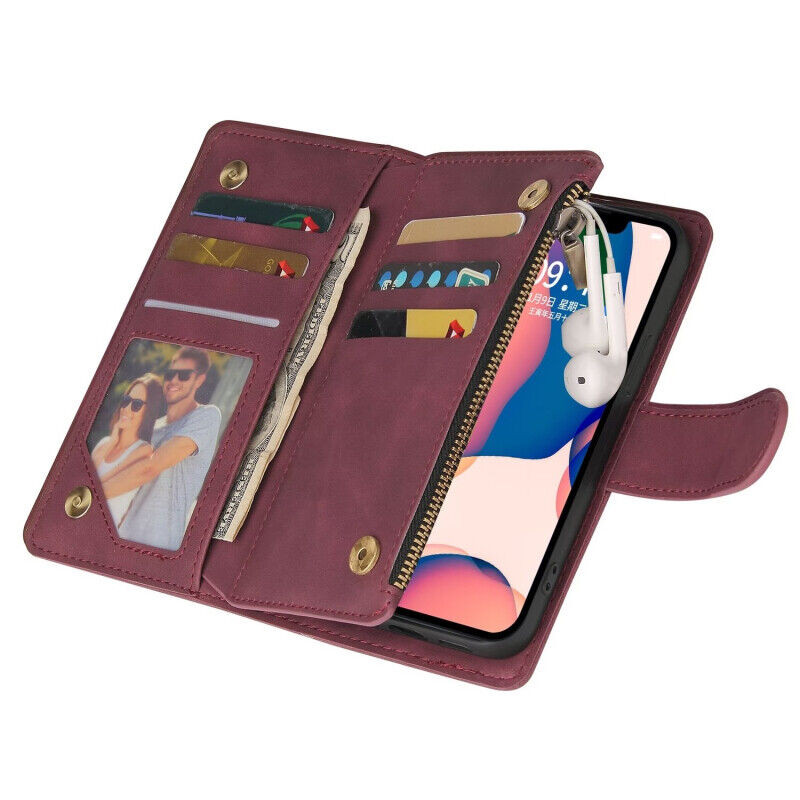 Zip Wallet Case for iPhone 16 15 14 13 12 11 Leather Flip Purse Card Stand Cover