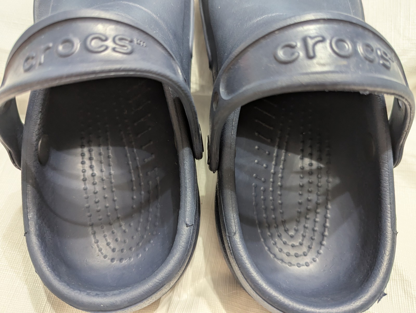 Crocs Bistro Navy with heel strap. Heel strap, Croc lock slip resistant treads. No ventilation holes. I've identified these shoes as pre-owned-excellent. I saw no signs of wear. They were dusty but not dirty.