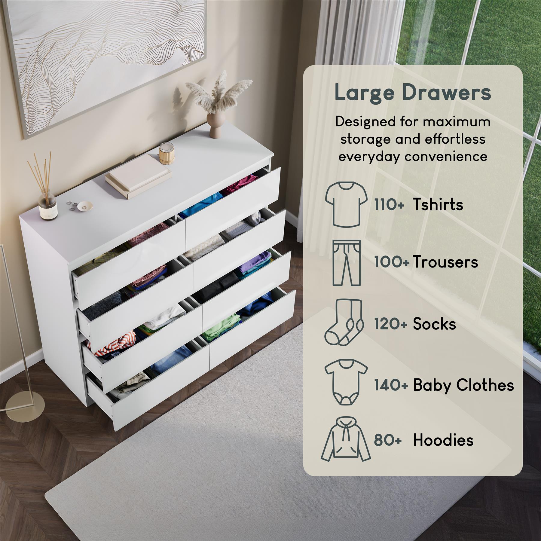 White High Gloss 8 Drawer Chest – Modern Handleless Sleek Bedroom Storage