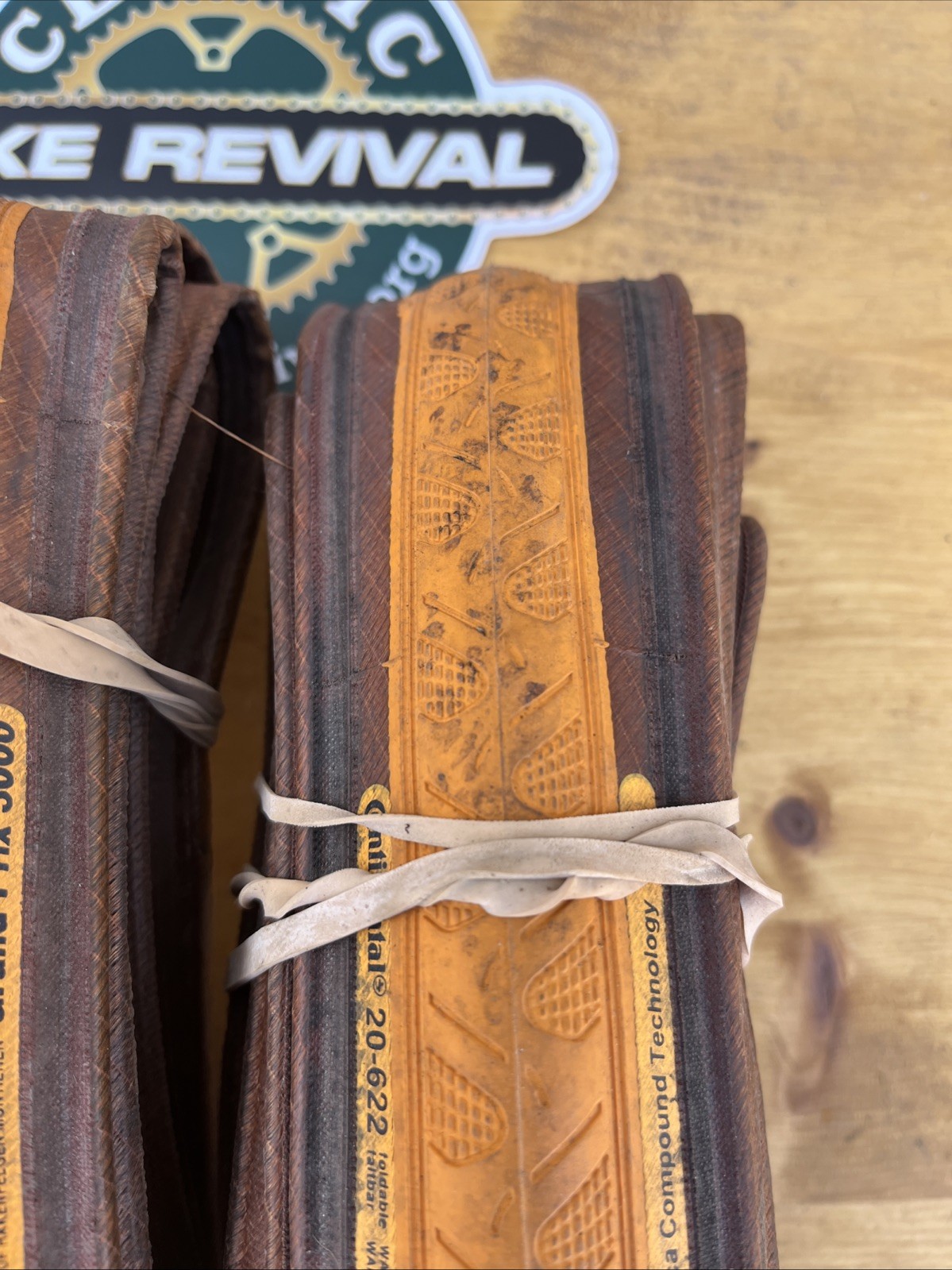 Continental Grand Prix 3000 tyres x2 Classic late 90s/00’s tyres 700 x 20mm Have seen light use only , tread is slightly mottled but I think will clean up See my other listings for more retro parts and follow us on Facebook Classic Bike Revival