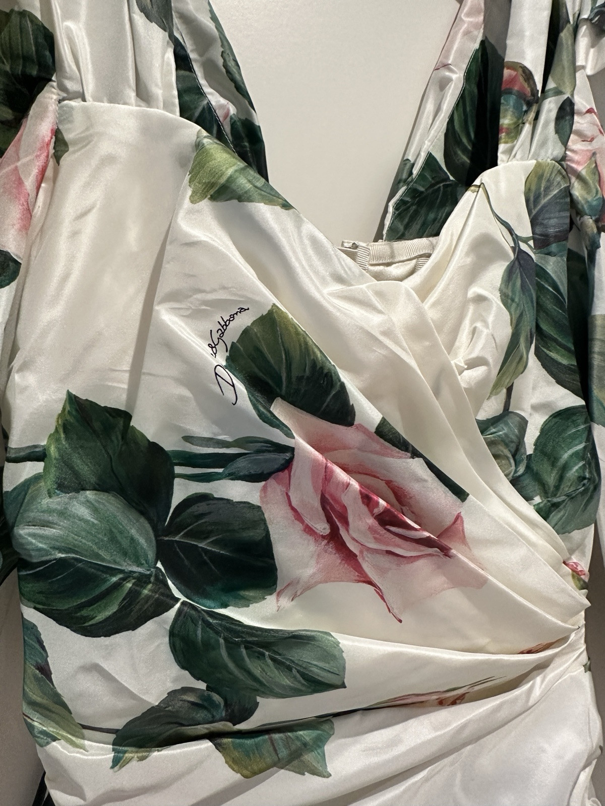 Dolce&Gabbana silk ruched floral mini dress women’s IT 40 S ecru Composition: 100% silk Lining: 92% silk, 8% elastane Brand new. Genuine. With tag. Please pay attention, THERE ARE FEW MINOR MARKS at the back lower part of the dress and a micro dot on the shoulder.