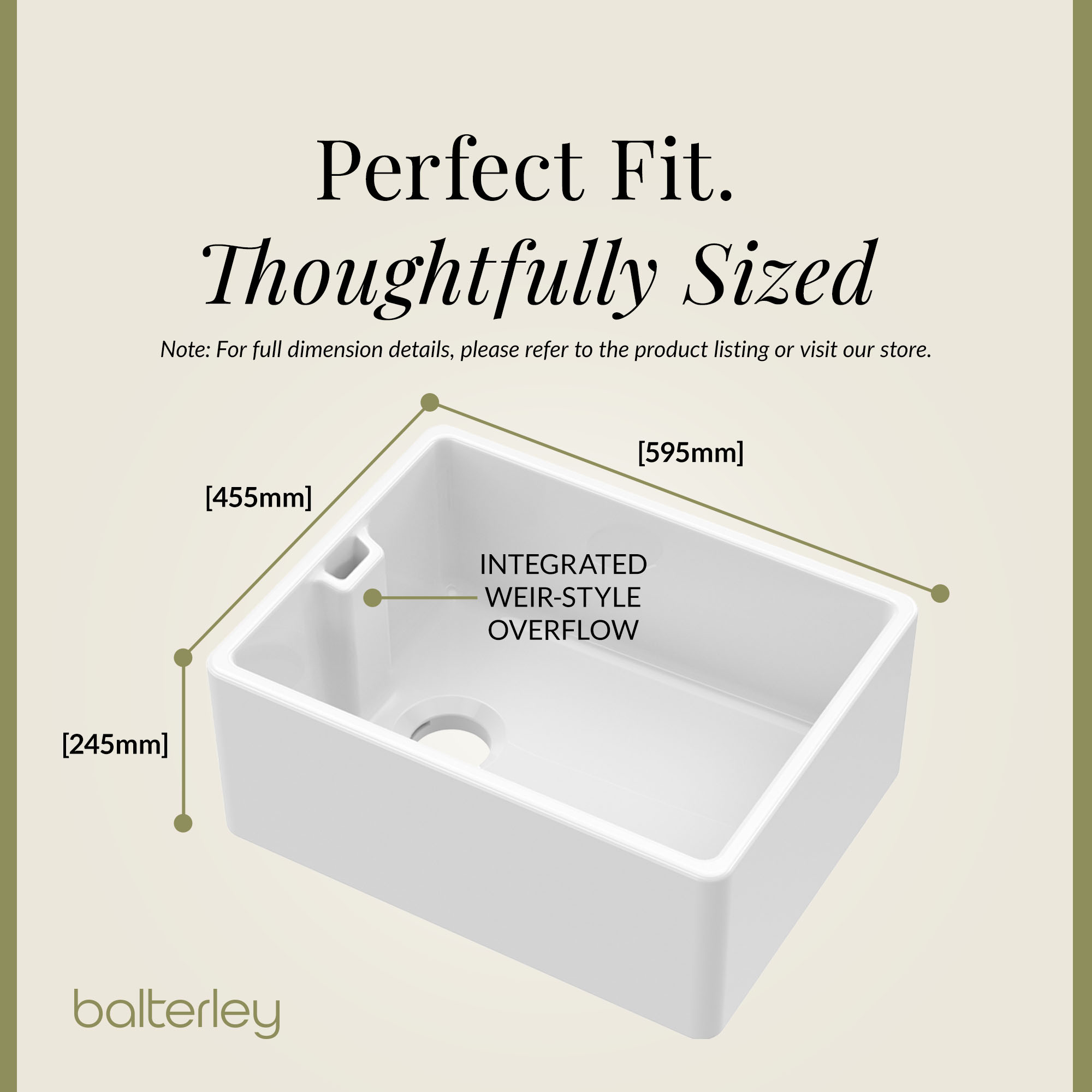 Single Bowl Belfast Kitchen Sink with Overflow, No Tap Hole - Multiple Sizes