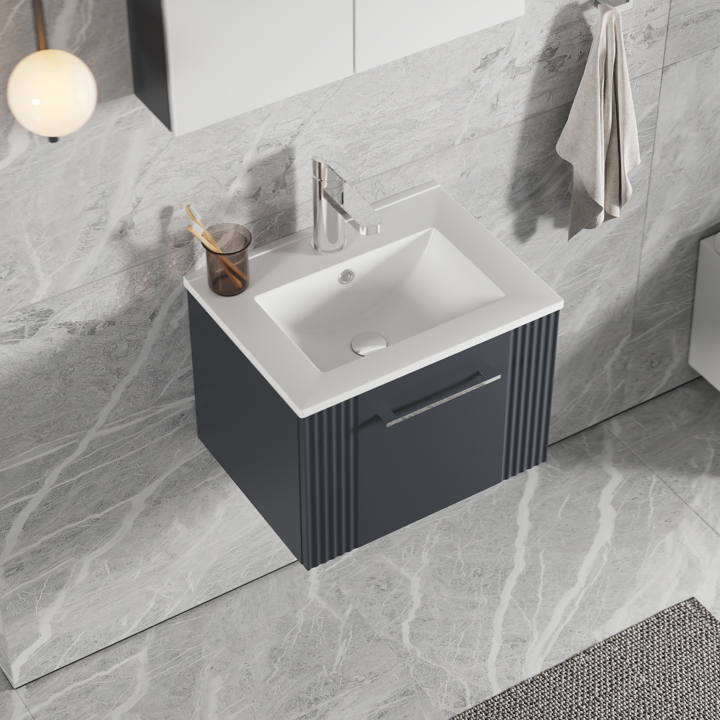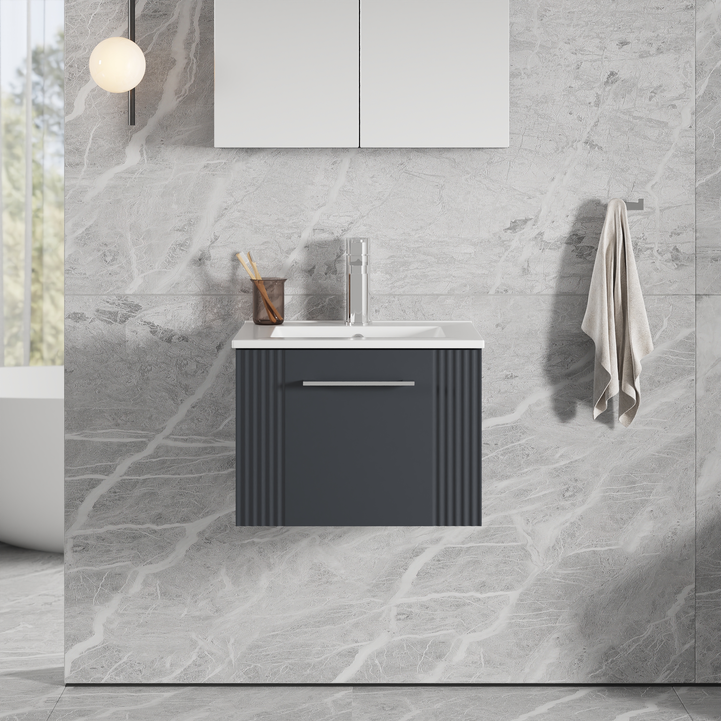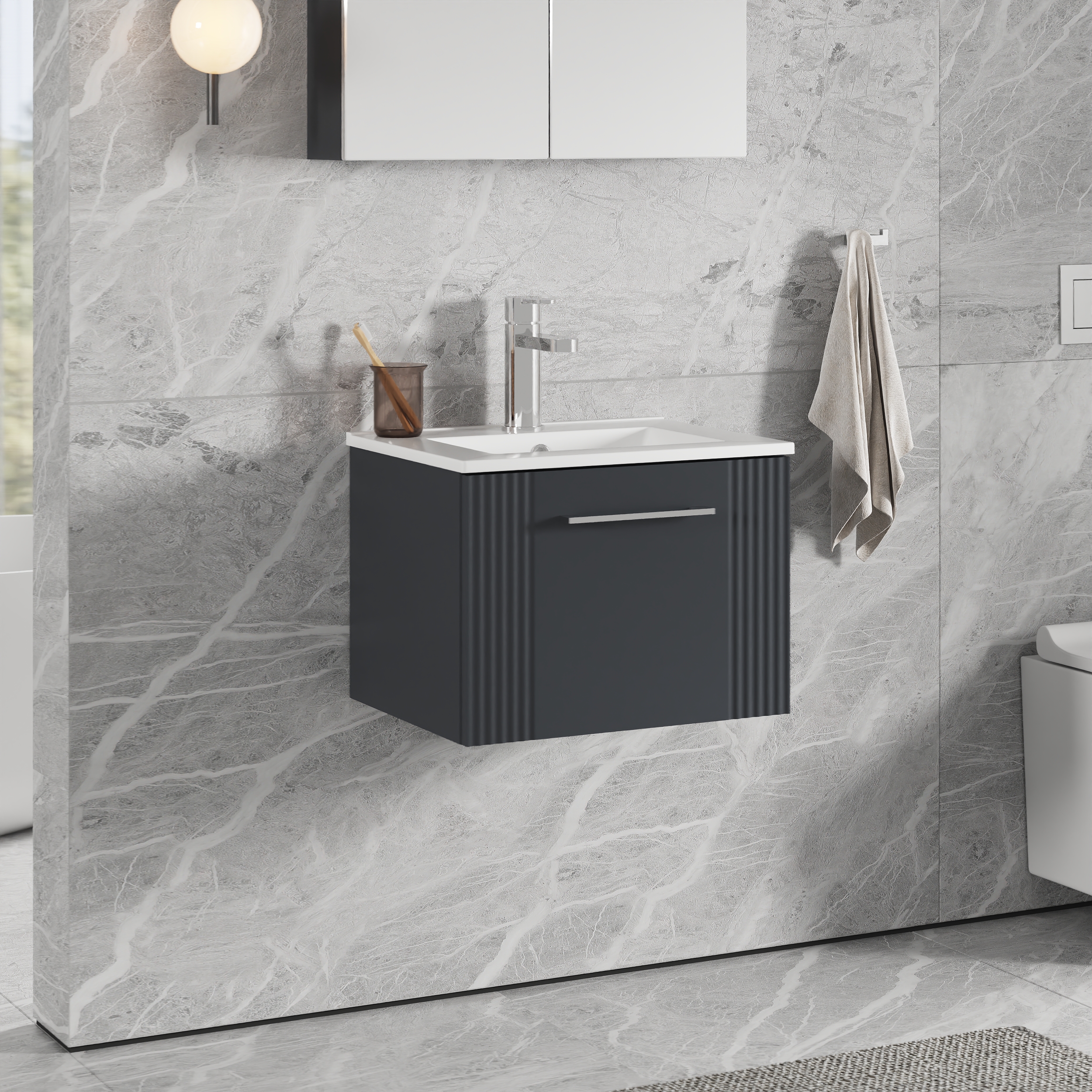 Retro 1 Drawer Wall Hung Vanity Unit with Minimalist 1 Tap Hole Ceramic Basin - 600mm - Satin Dark Grey Balterley