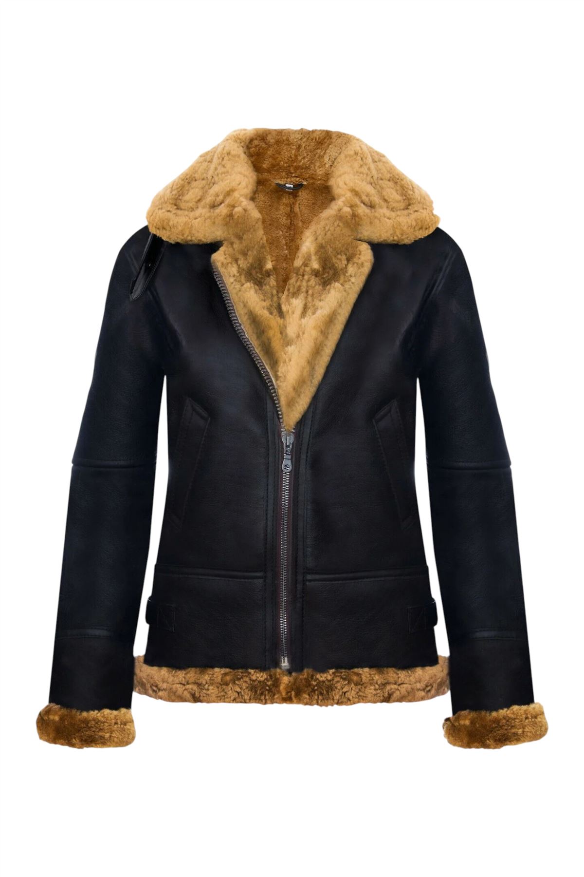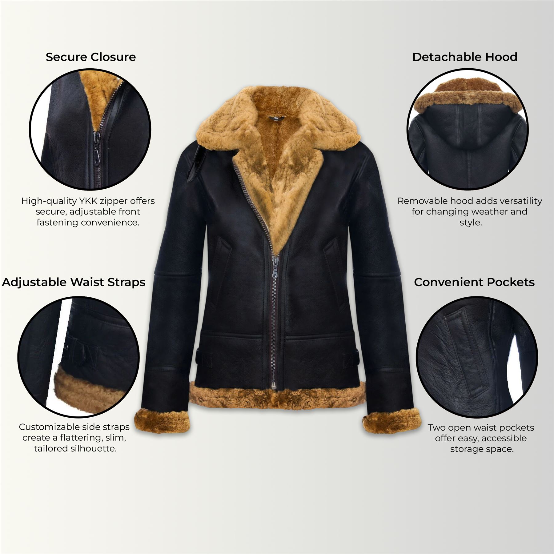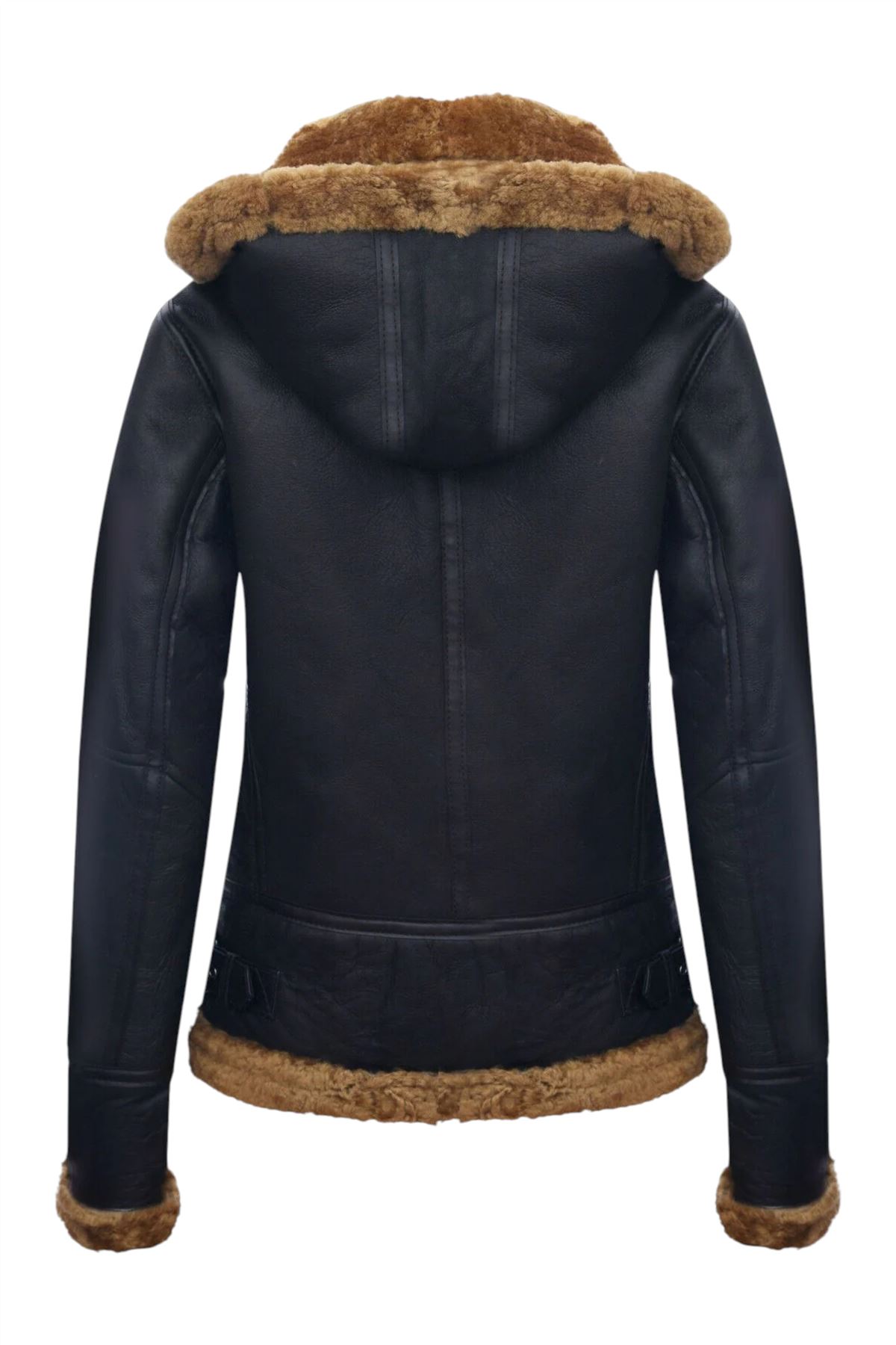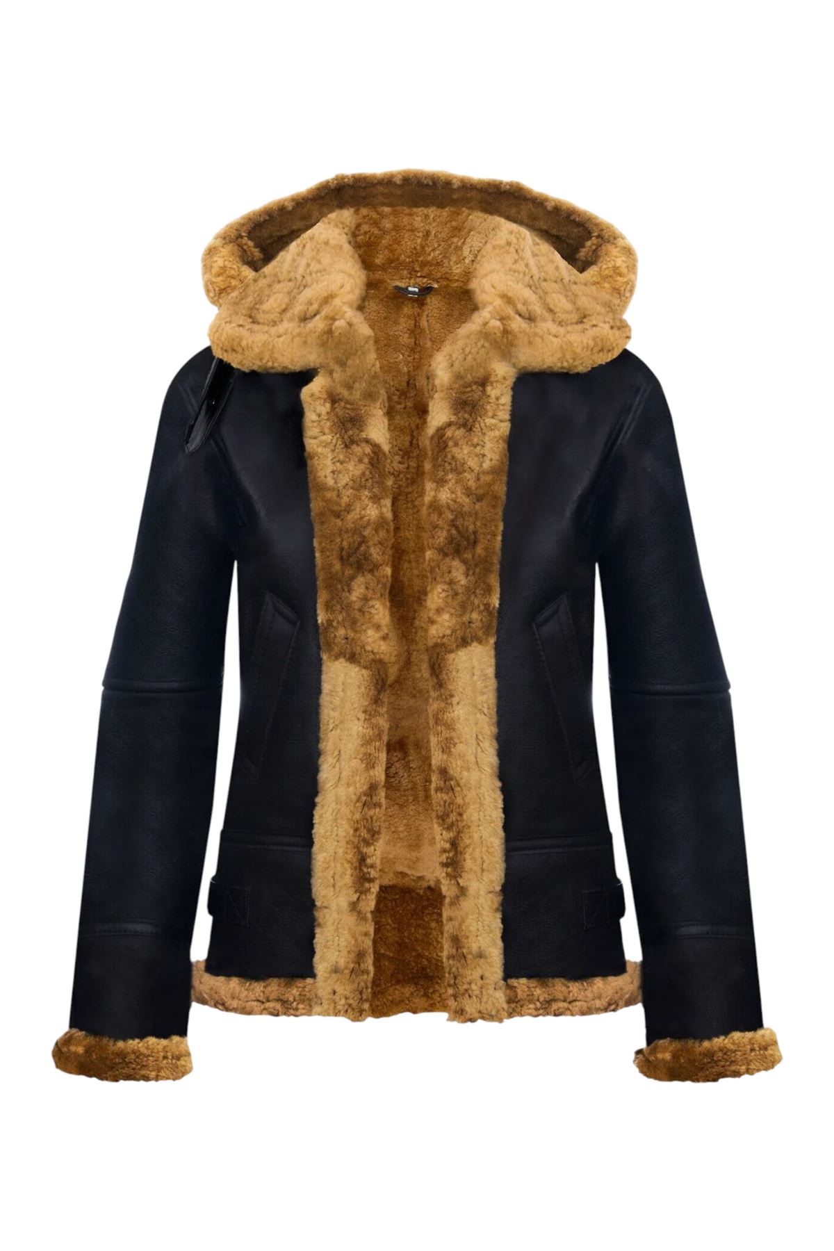 Ladies Sheepskin Jacket Black B3 Flying Hooded 100% Natural Searling Jacket NV39