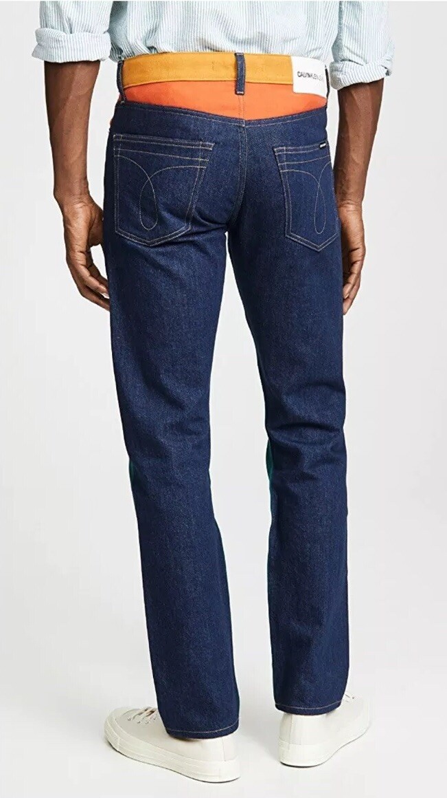 Fabric: Denim Multi-color panel design Straight-cut style Button at waist Zip at fly Slant hip pockets Patch back pockets Shell: 100% cotton Wash warm Imported, Tunisia Style #CJEAN30209 Measurements from size 32 Rise: 12.25in / 31cm Inseam: 32in / 79cm Leg opening: 15.75in / 40cm