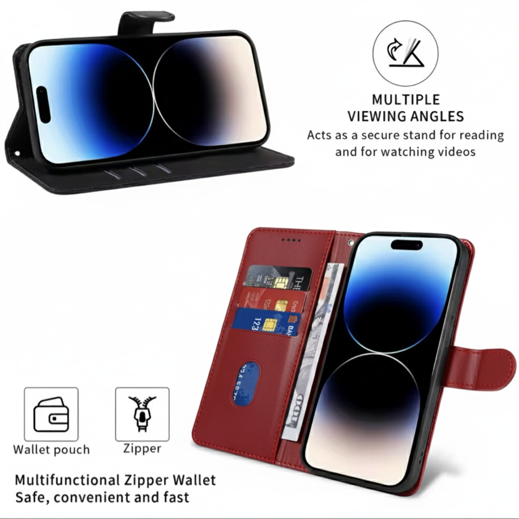 Zip Wallet Case for iPhone 17 16 15 14 13 12 Leather Flip Purse Card Stand Cover