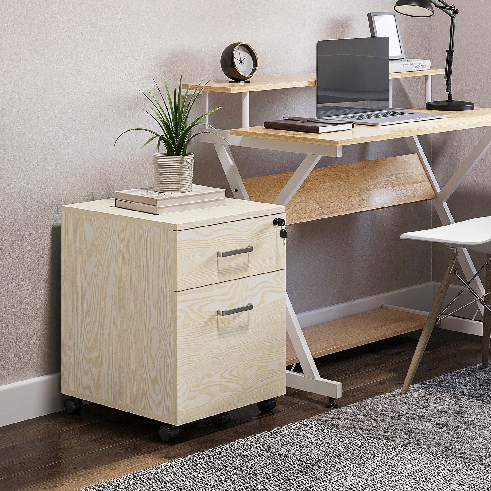 VINSETTO 2-Drawer Locking Office Filing Cabinet w/ 5 Wheels Rolling Storage Letters in Light Brown Light Brown