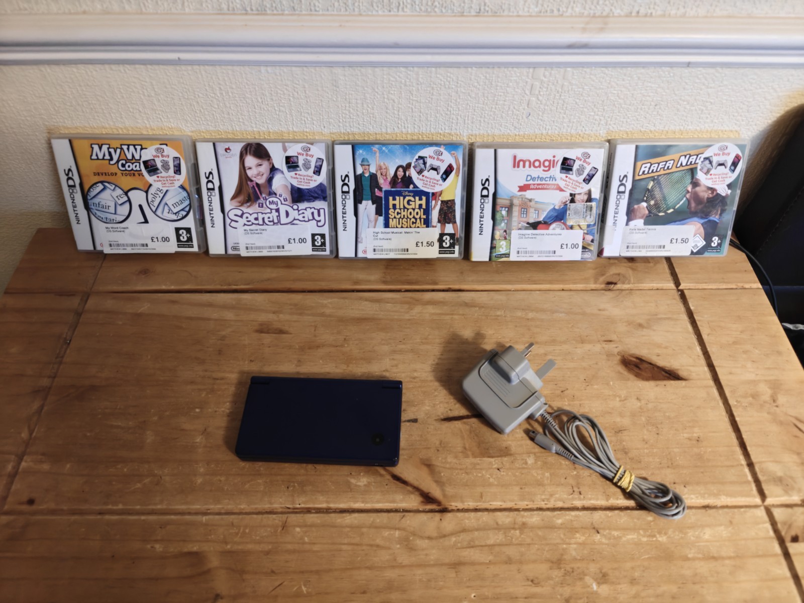 This is a Nintendo DSi blue console that's in pretty good cosmetic condition, there are light scratches on the body of the console but the screens look in very good condition as shown in the picture. I couldn't find the original stylus so I have put a light blue stylus with it.. Games included and the condition of them are stated below: Rafa Nadal Tennis, Imagine Detective Adventures, High School Musical Makin The Cut!, My Word Coach and My Secret Diary - Games are fully tested and come in official cases with manuals. Serial number of the console has been noted.