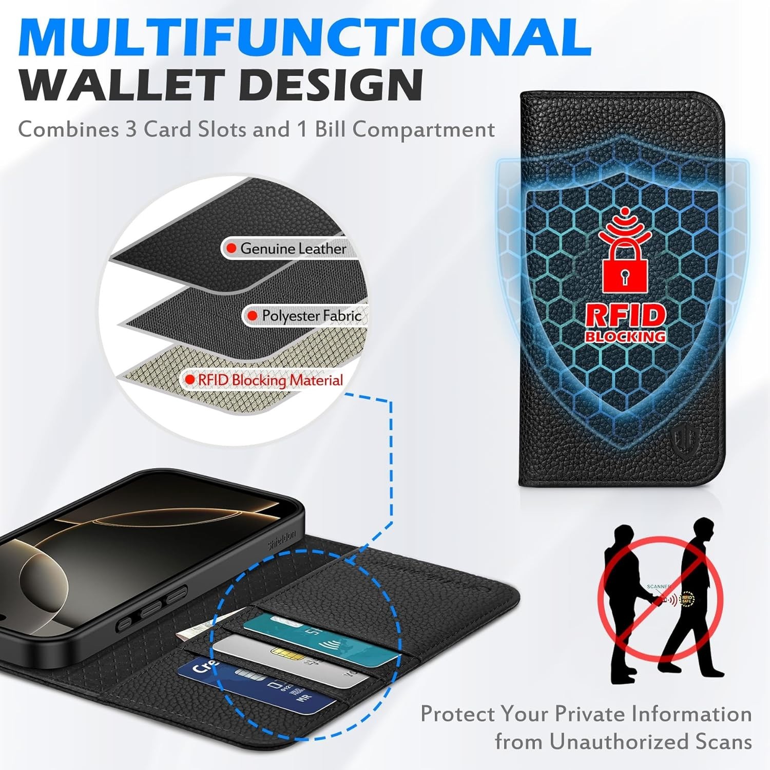 SHIELDON Case for iPhone 16 Pro, Genuine Leather Wallet Case, RFID Blocking