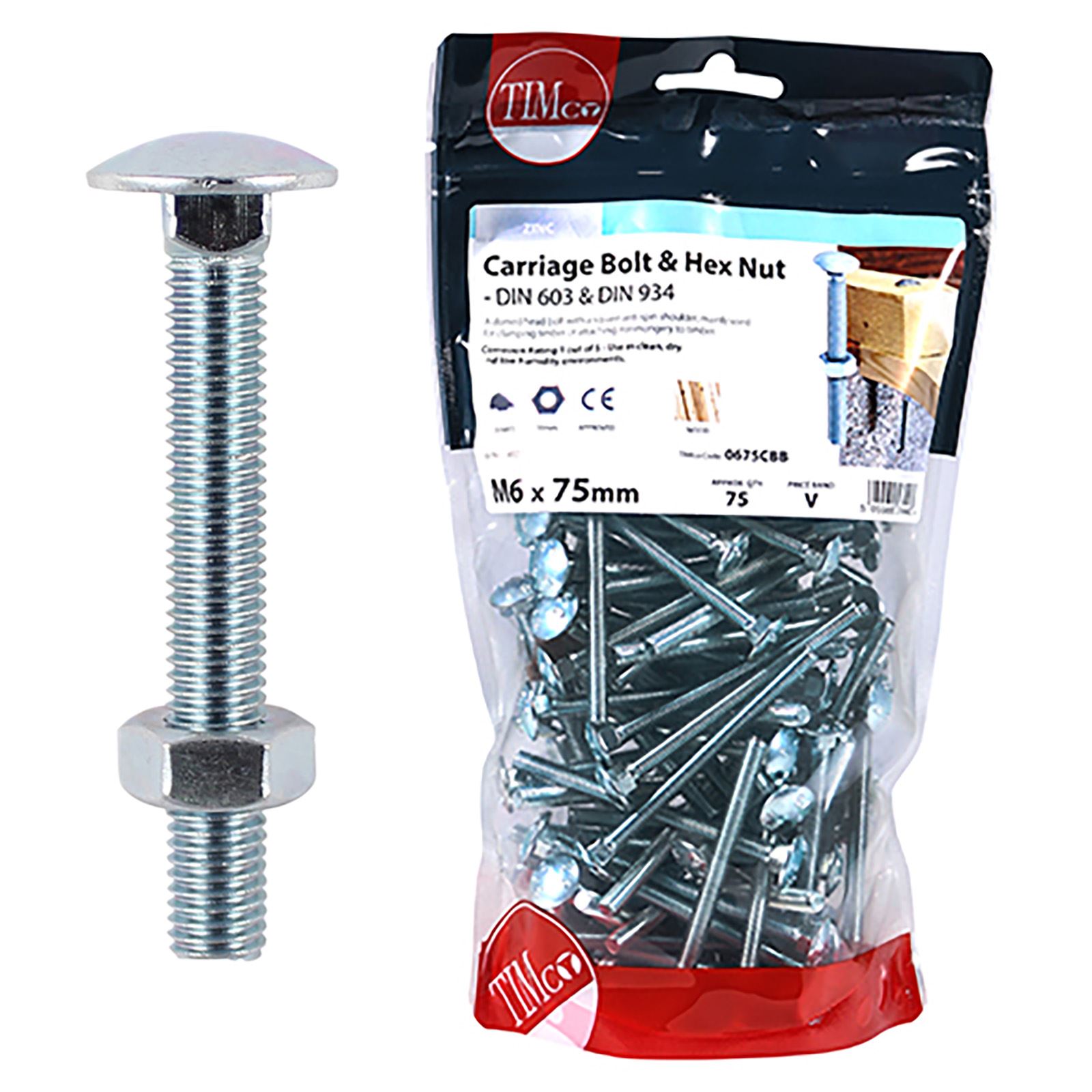 TIMCO Carriage Bolts with Hex Nuts 4.8 Grade Zinc Carbon Steel TIMbag M6-M12 - Choose Size. All sizes up to and including 150mm are fully threaded and lengths 160mm and above all have 150mm thread length.