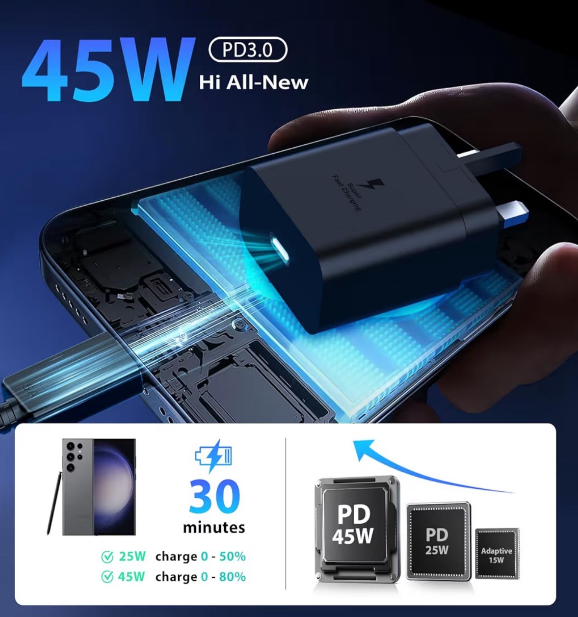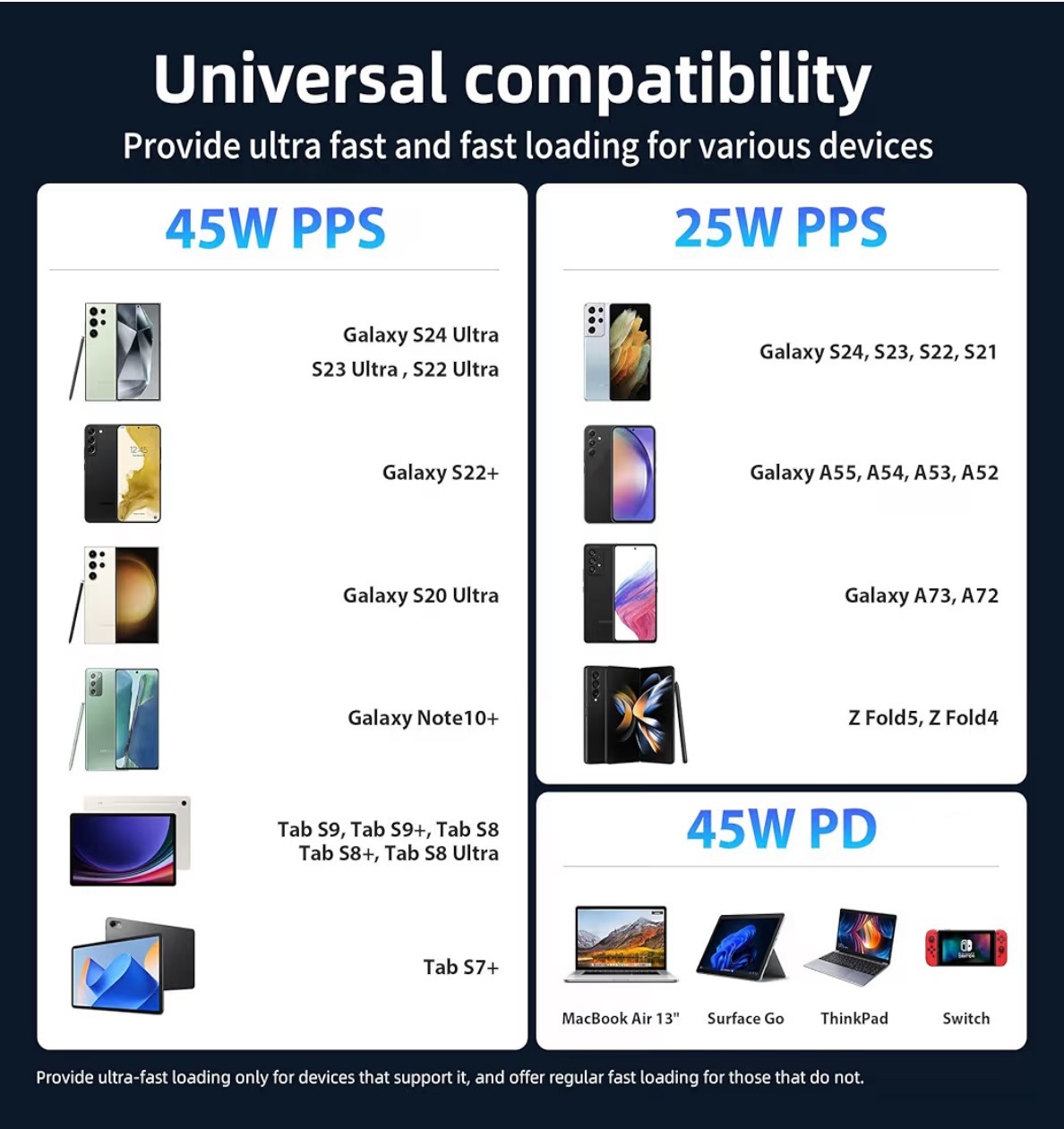 It ensures efficient and safe charging while extending the lifespan of your Galaxy devices. Supports almost all USB-C devices. Including Samsung Galaxy S23/S23+/S23 Ultra/S22/S22+/S22 Ultra/S21 FE/S21/S21+/S21.