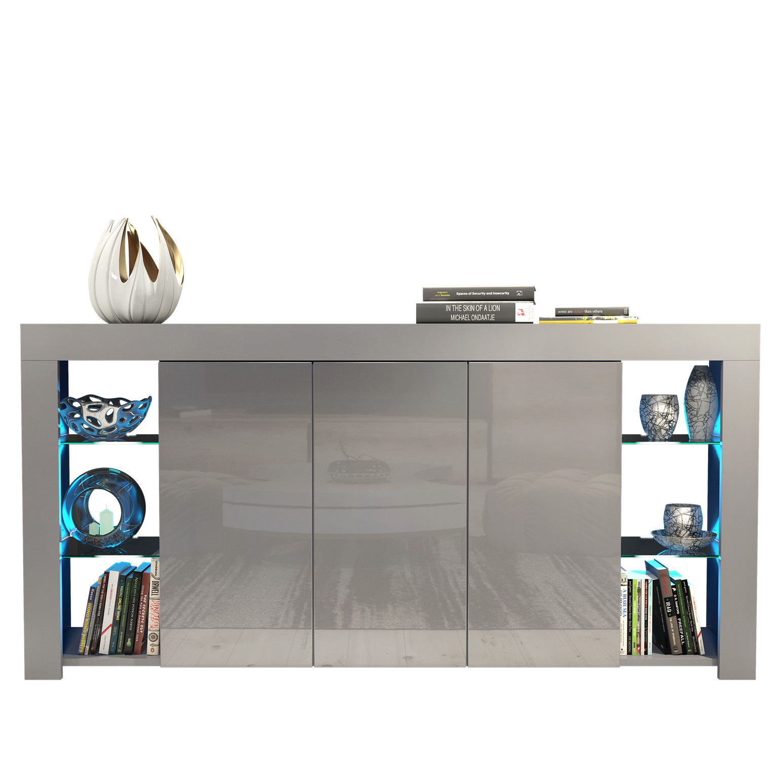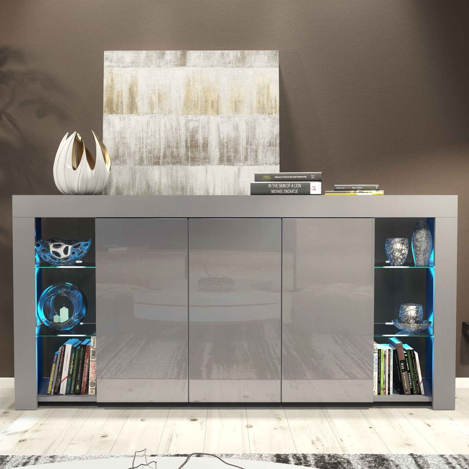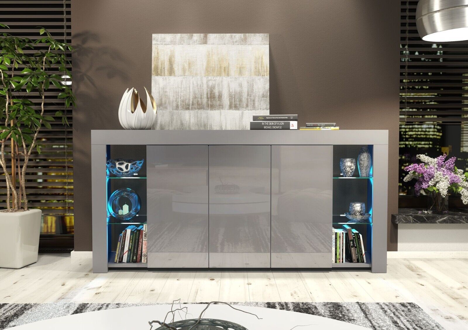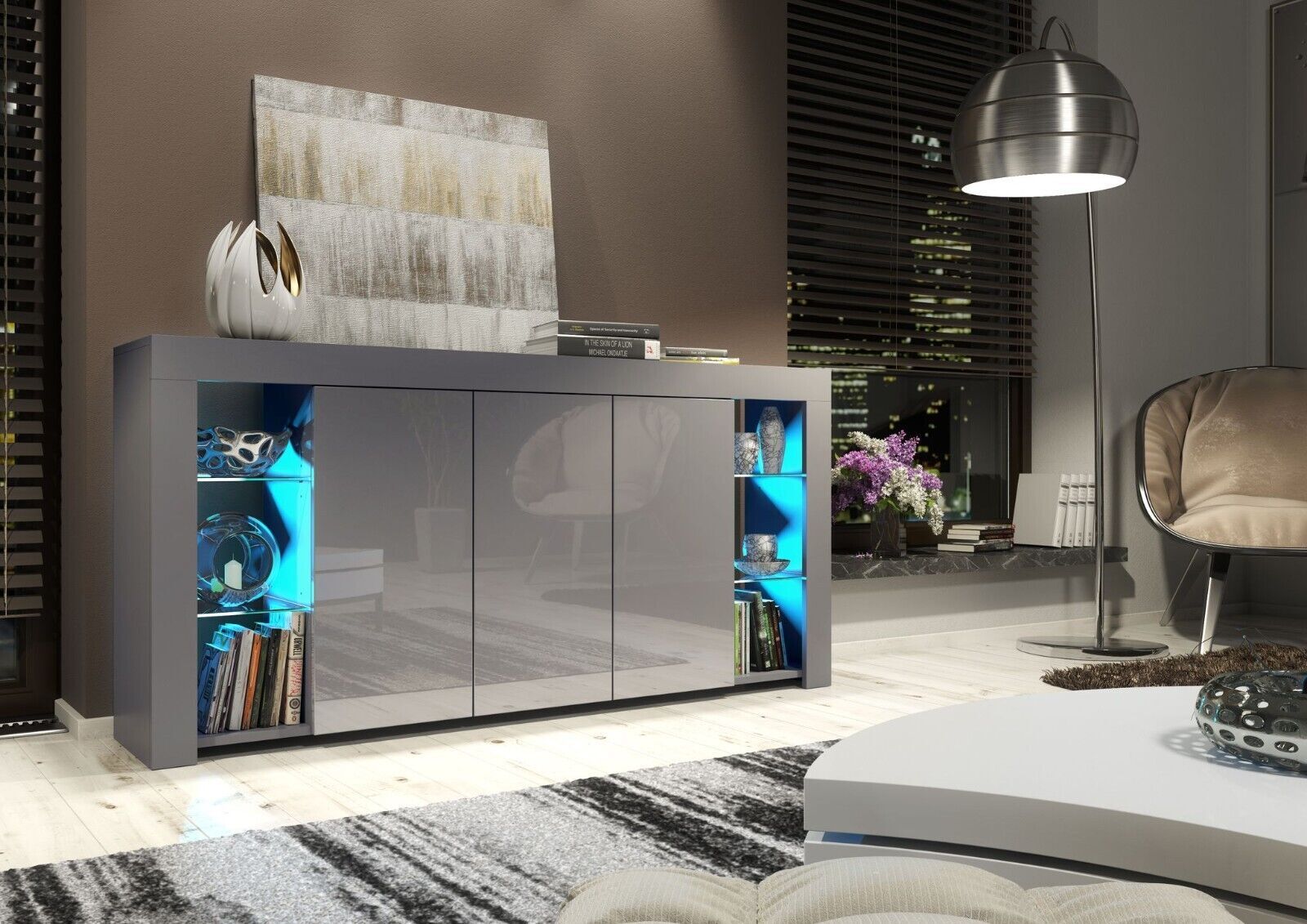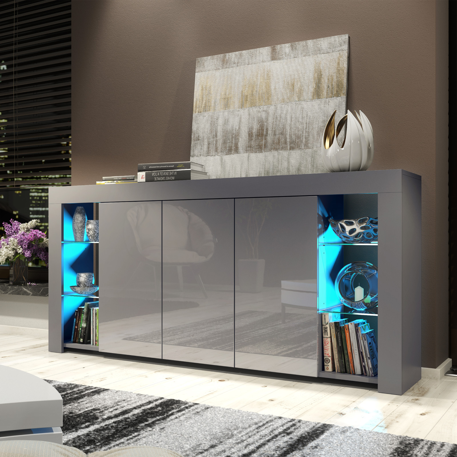 Modern 164cm Sideboard with Matt Body and Gloss Doors | Optional LED. Featuring adark grey matt body anddark grey gloss doors, it’s a perfect choice for modern interiors. Choose between a version with or withoutenergy-efficient LED lighting to suit your style and needs.