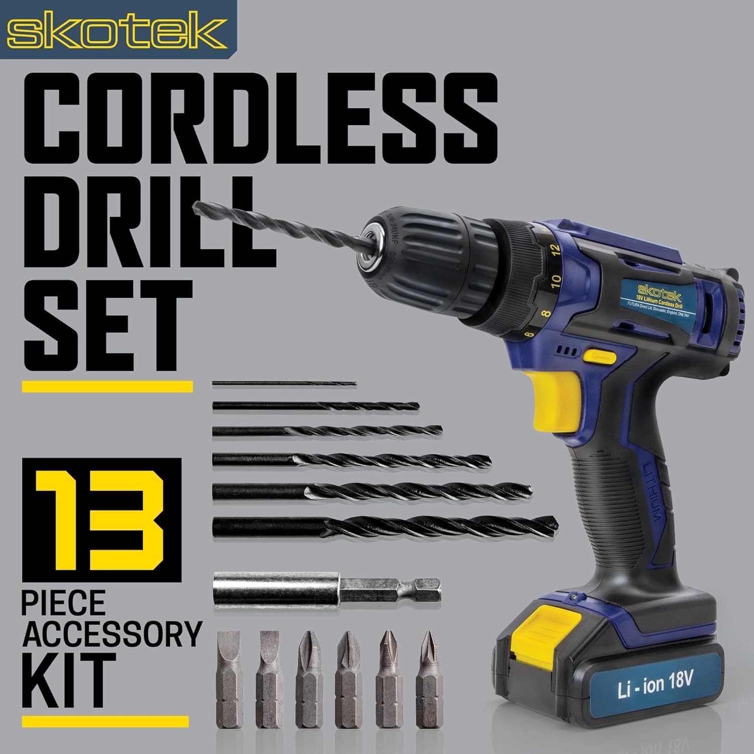 Skotek Cordless Drill Driver 18V Lithium-Ion, 13Pc Electric Screwdriver Set, LE