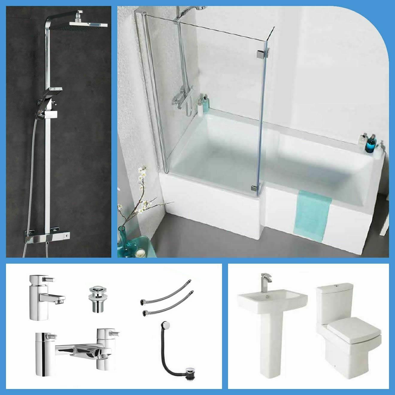 L Shaped Bathroom Suite 1700 Bath 850mm Vanity Unit BTW Toilet WC Taps & Shower