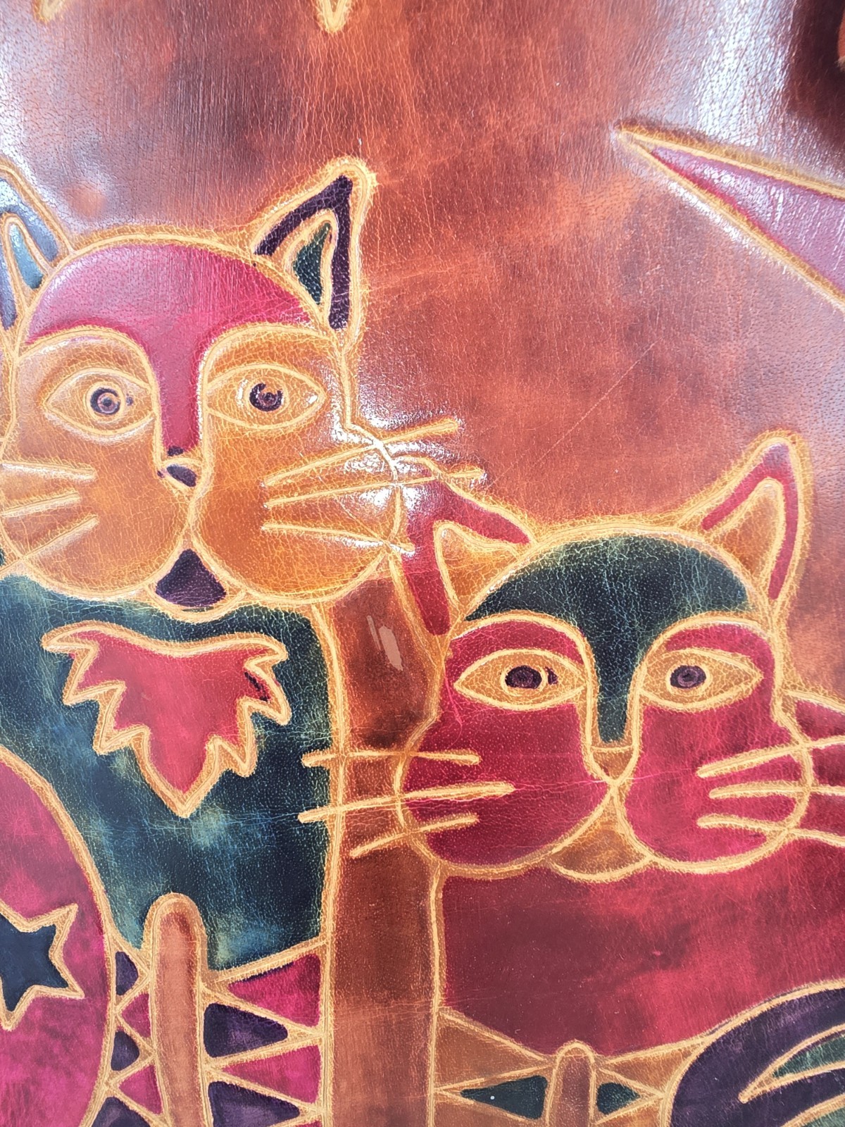 Vtg Emily Ann of Boca Raton Brown Leather Cat Handbag Tote Purse Cats Boho 1994