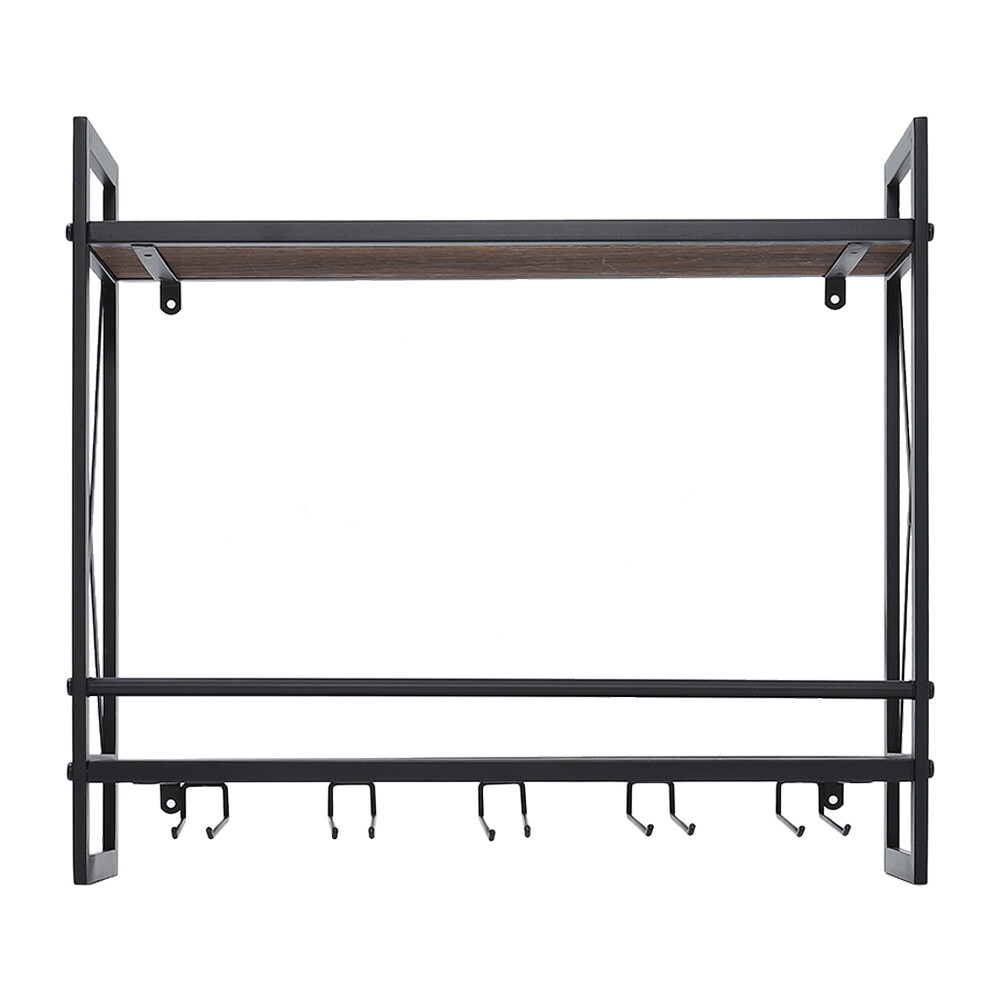 Rustic Wall-Mounted Wooden Wine Rack with Glass Holder 2 Tier Shelf Metal Frame