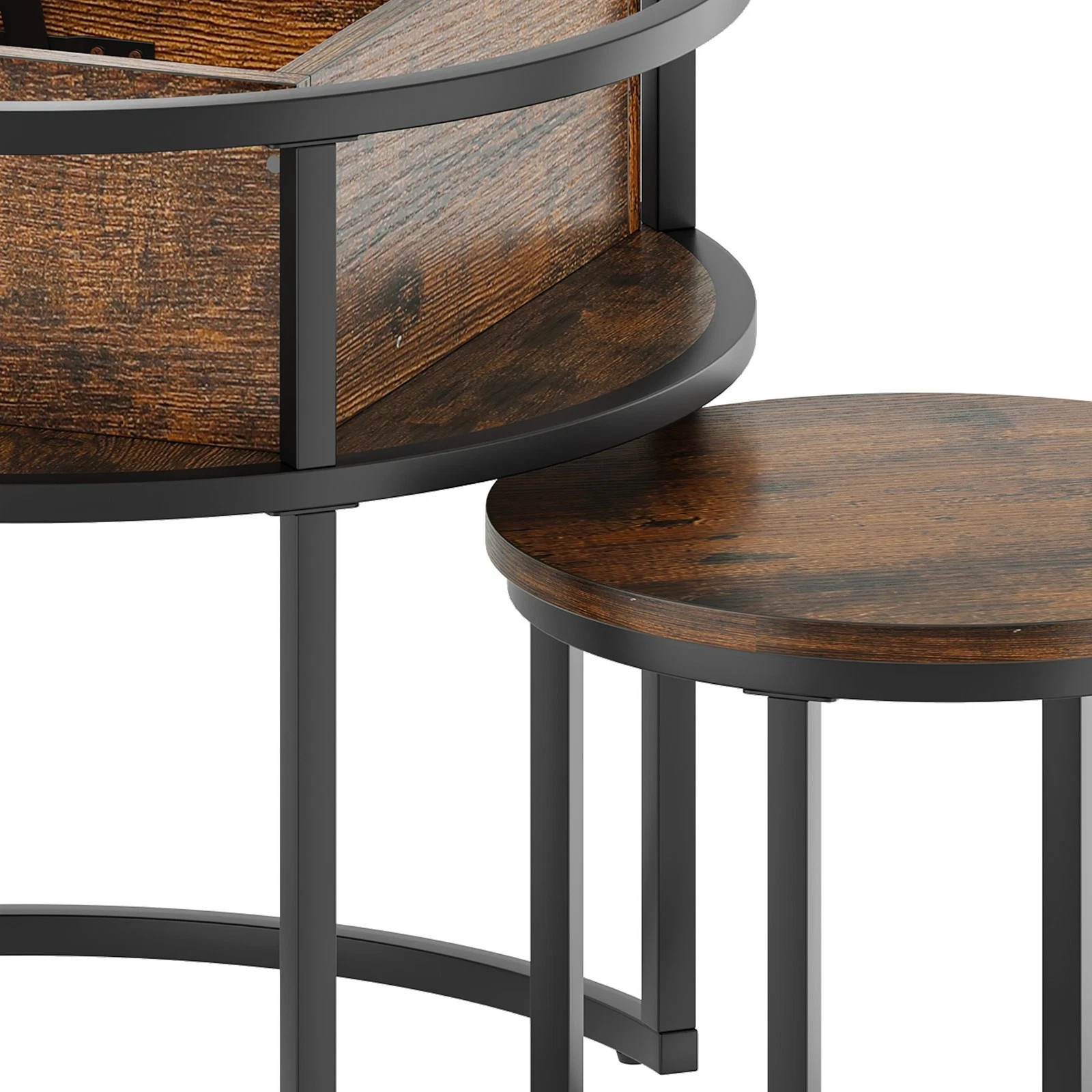 A classic brown hue and natural material texture blend harmoniously with diverse interiors. Built with double-layer reinforced iron tubes and chipboard, while rounded edges ensure hand safety. This unique space-saving design features two tables (60 x 60 x 50 cm and 38 x 38 x 30 cm).