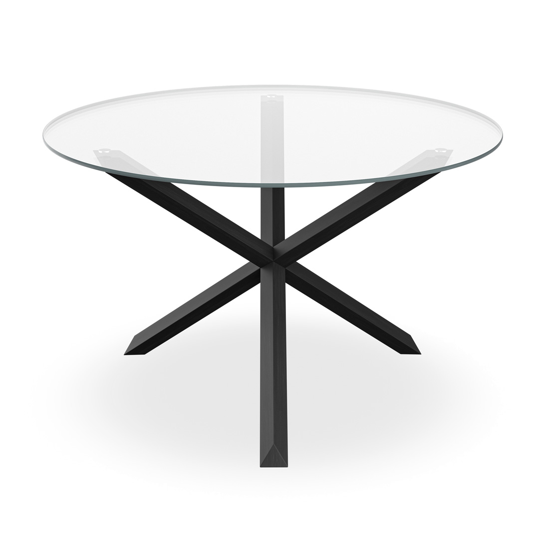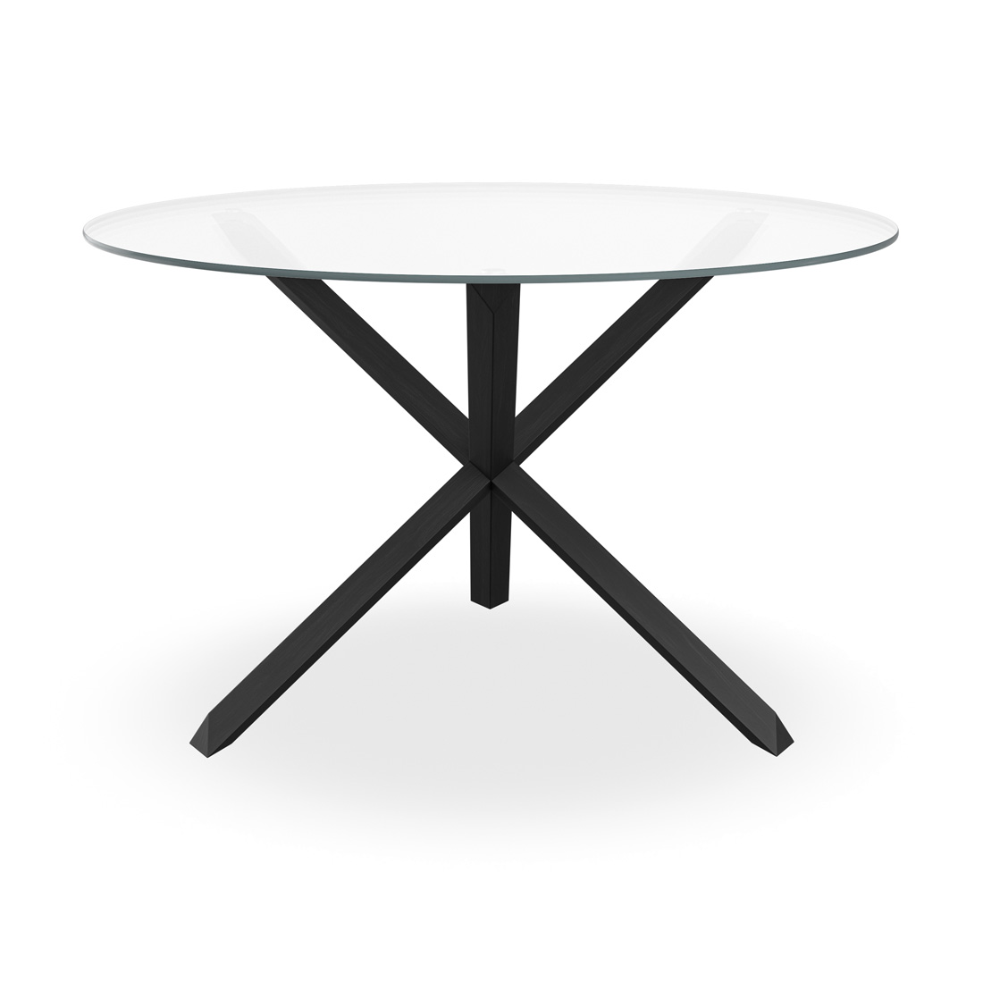 MALVERN ROUND DINING TABLE AND CHAIRS - GLASS TOP w OAK BLACK LEGS + MAYA CHAIR