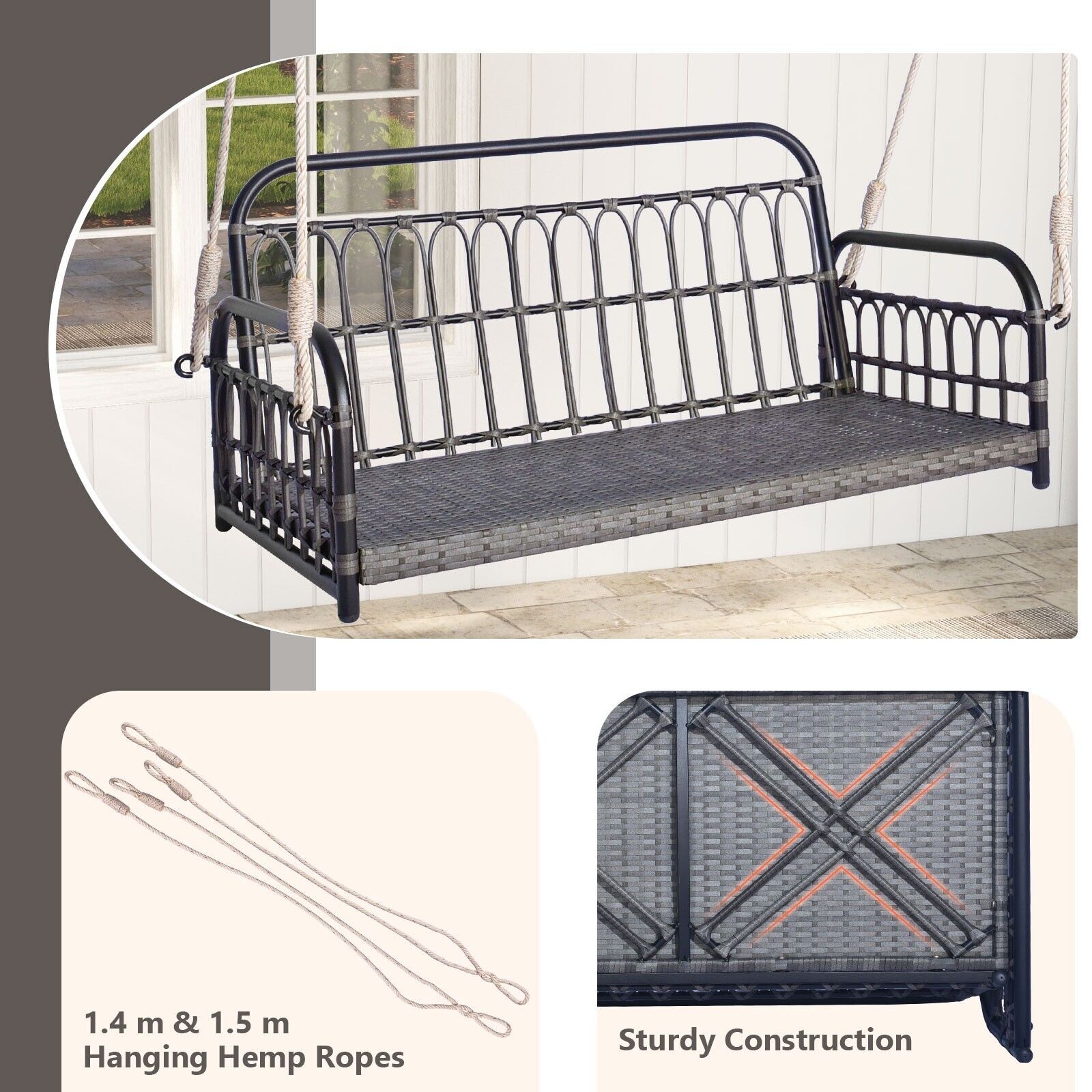 COSTWAY 2-Person Patio Wicker Swing Chair Hanging Outdoor Swing Bench w/Cushions