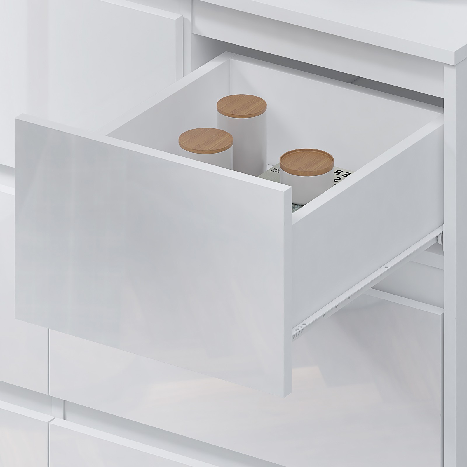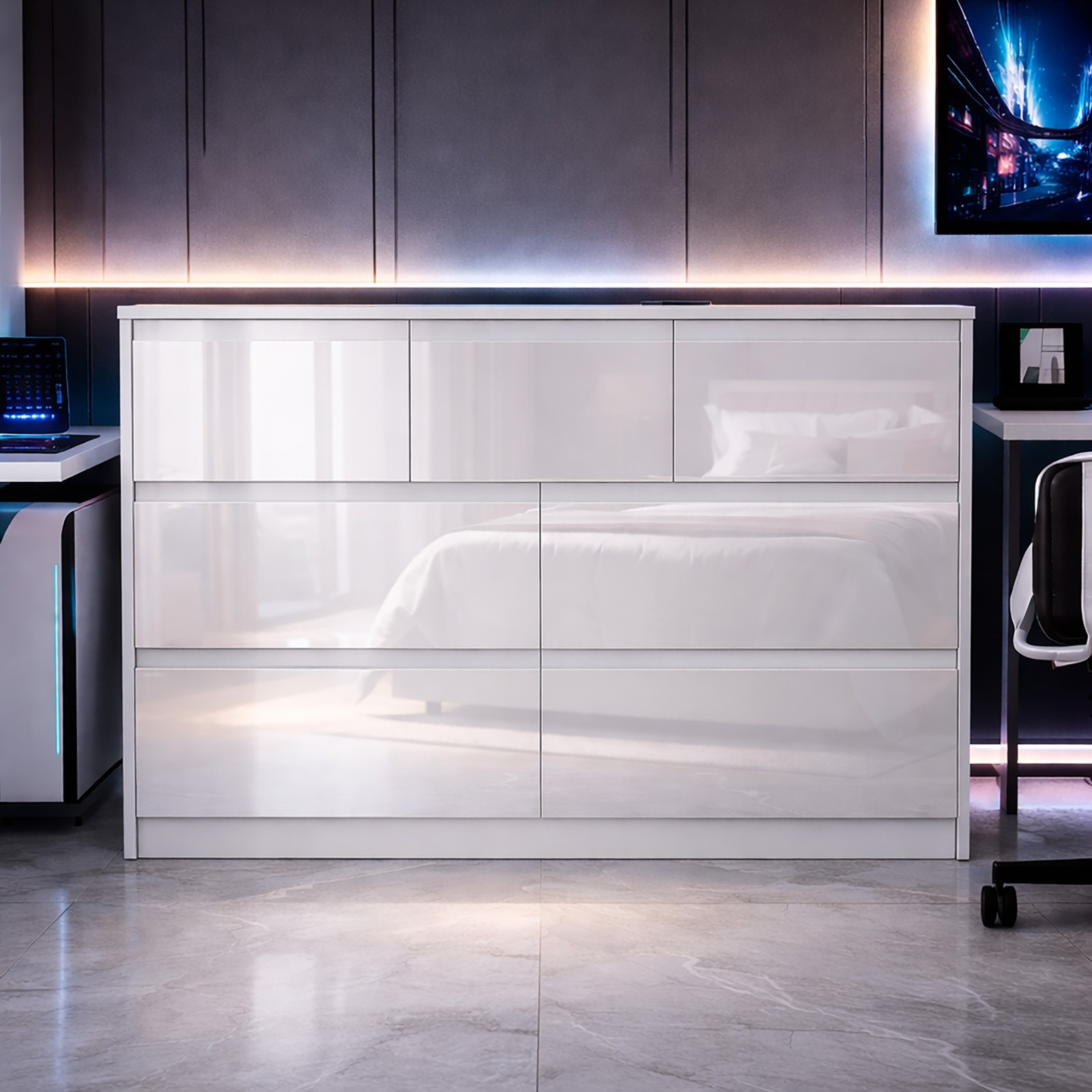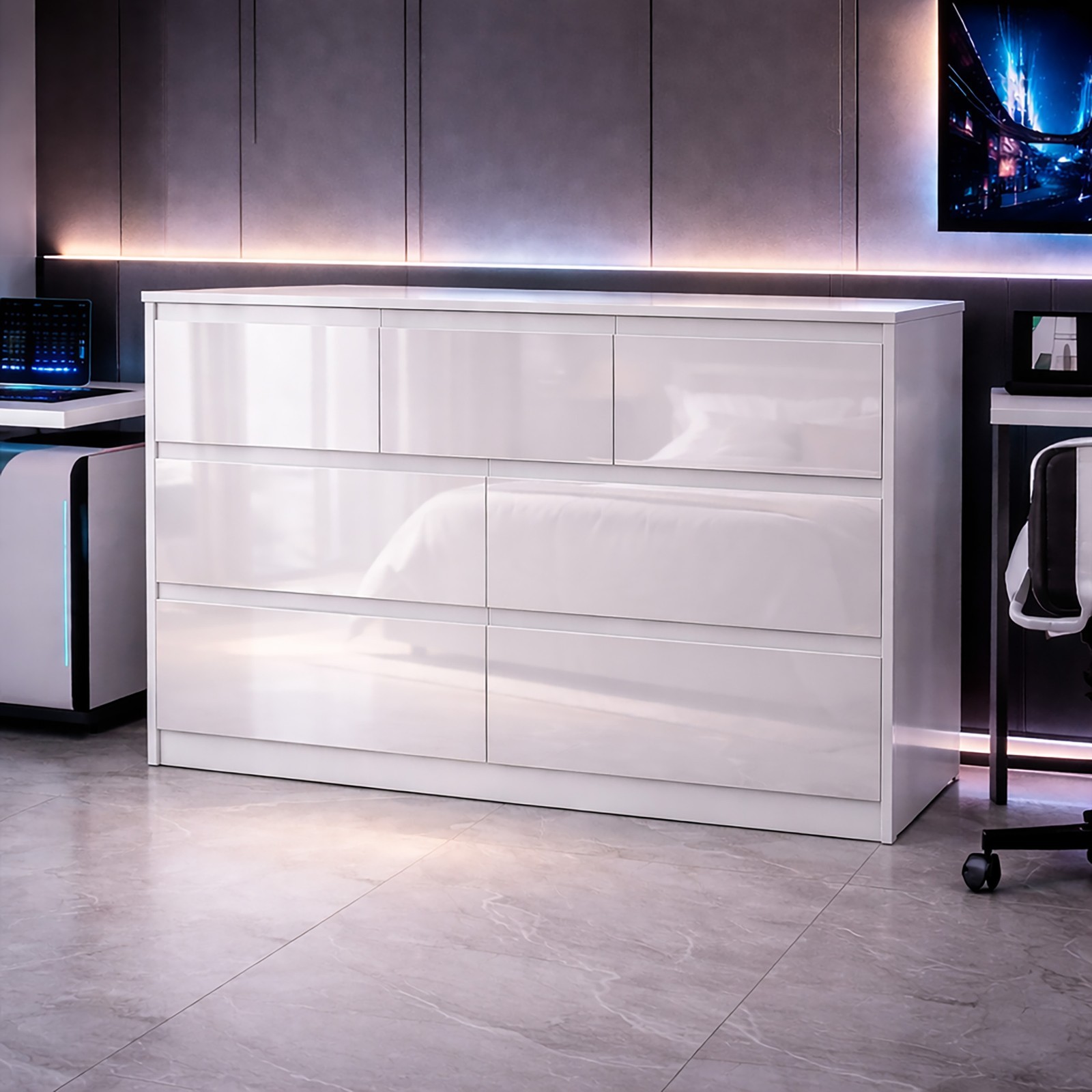 White High Gloss 8 Drawer Chest – Modern Handleless Sleek Bedroom Storage