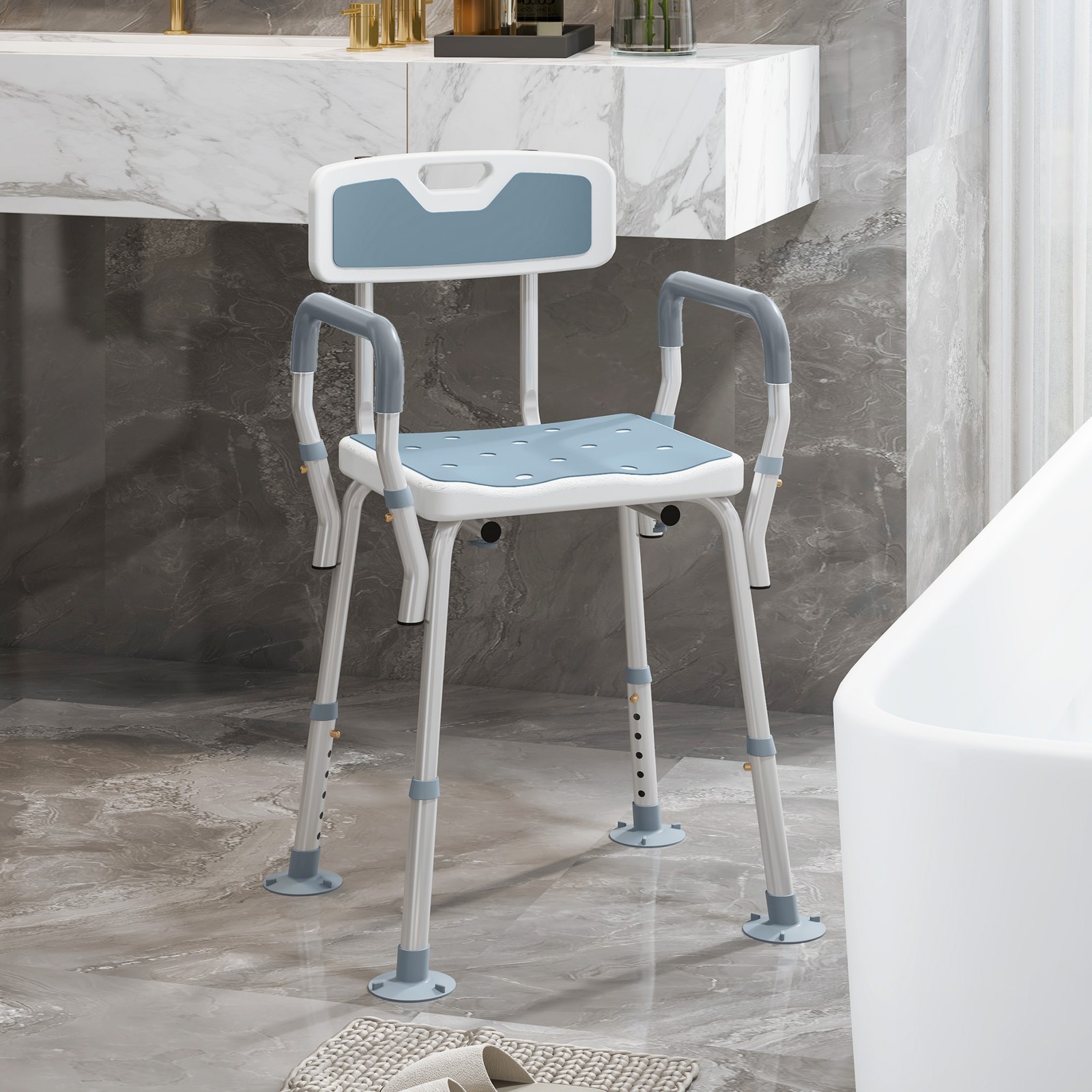 HOMCOM EVA Padded Shower Stool with Arms 4 Suction Foot Pads, Light Blue