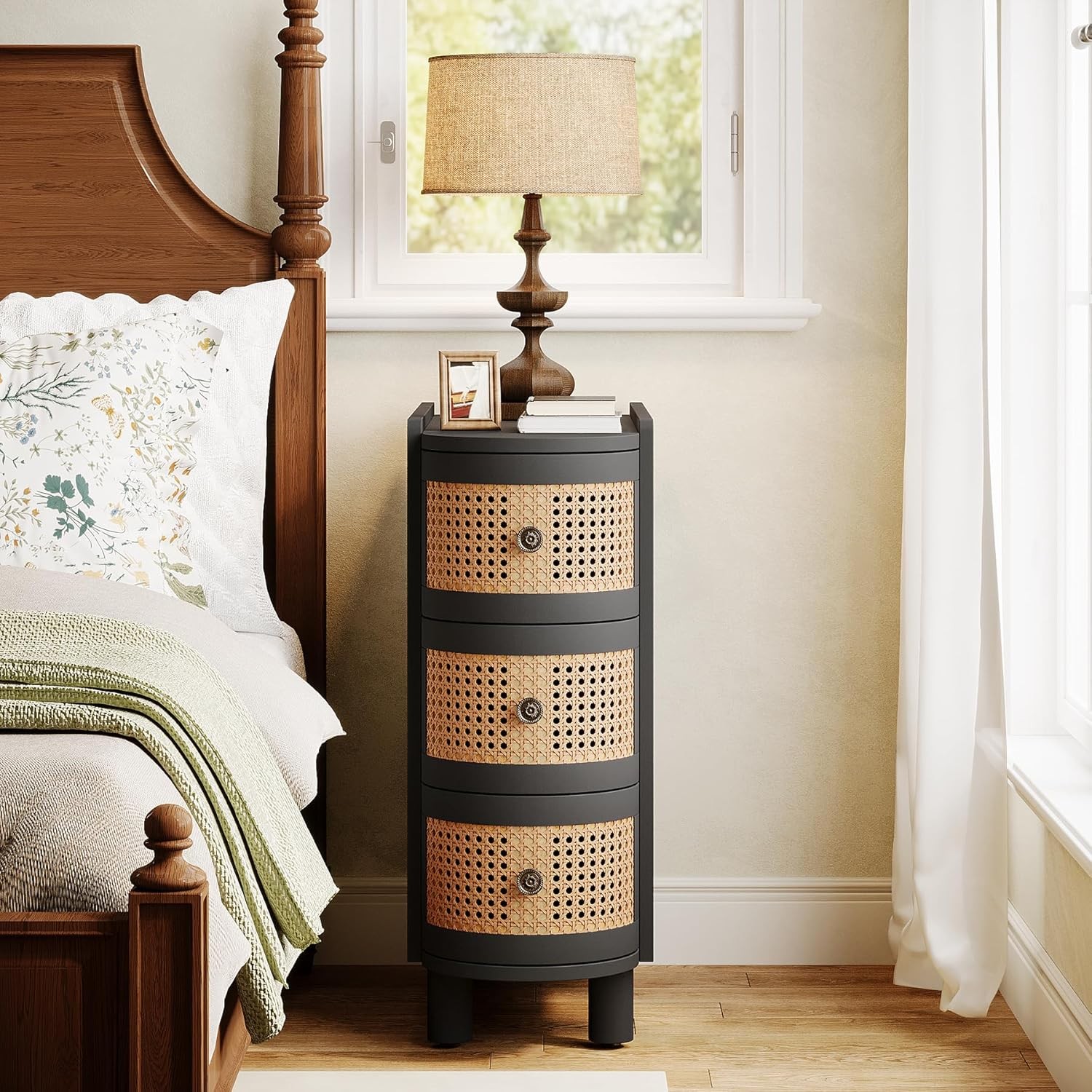 2-set Solid Wood Side Table, 3-Drawer Rattan with Exquisite Embossed Handles for Living Room, No Assembly Required (Black & Oak) - Tribesigns