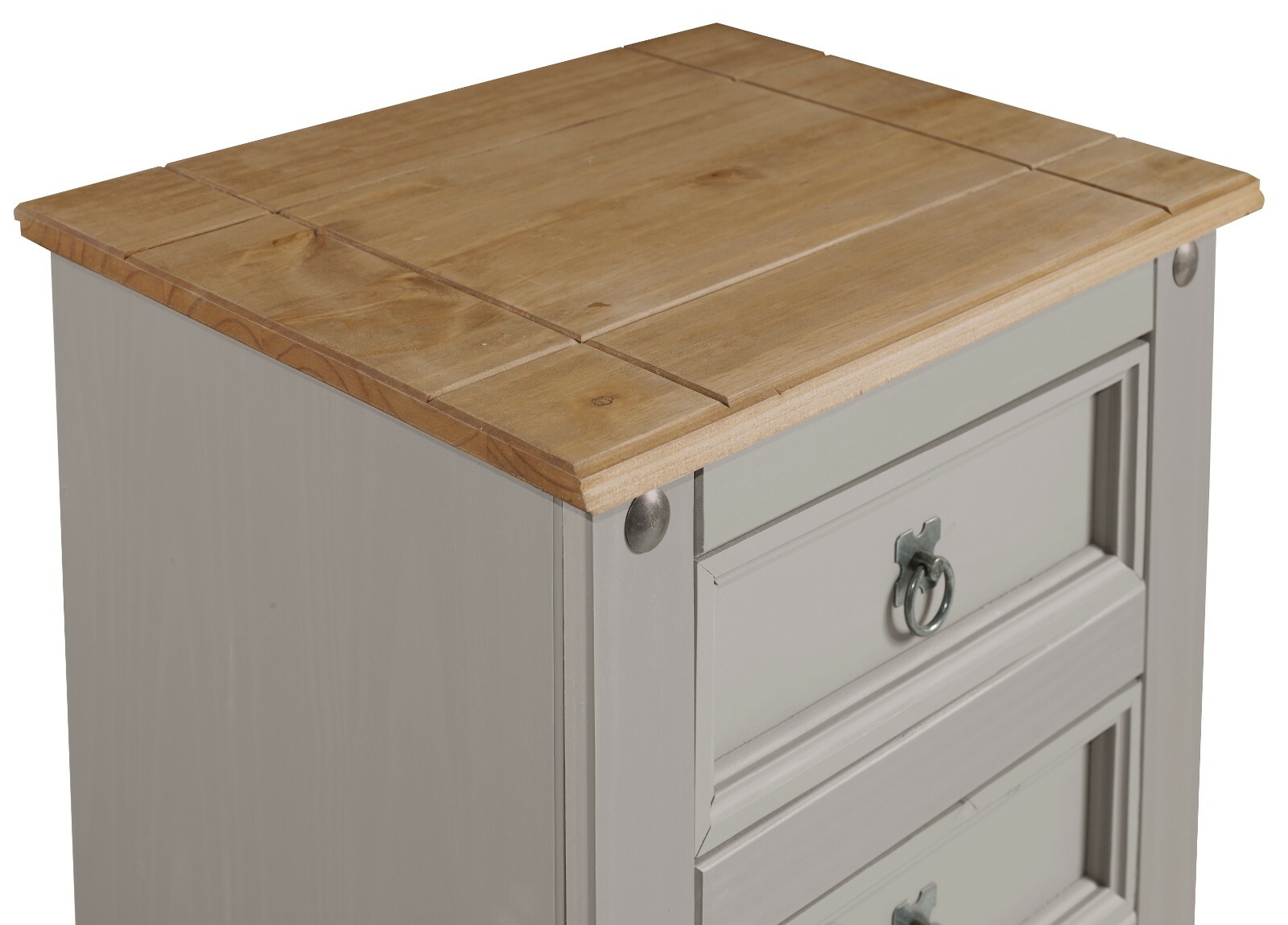 The Inset grooved top is waxed to enrich the natural look of the pine while the subtle grey wash body allows the natural grains and textures of the wood to show through. Corona Grey Wax 5 Drawer Narrow Chest.