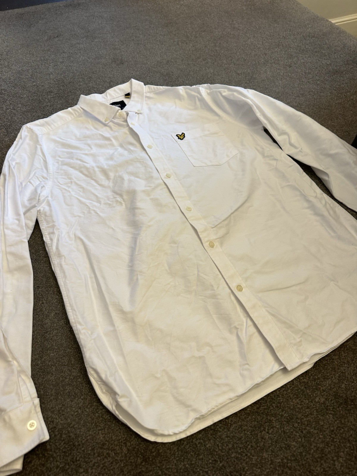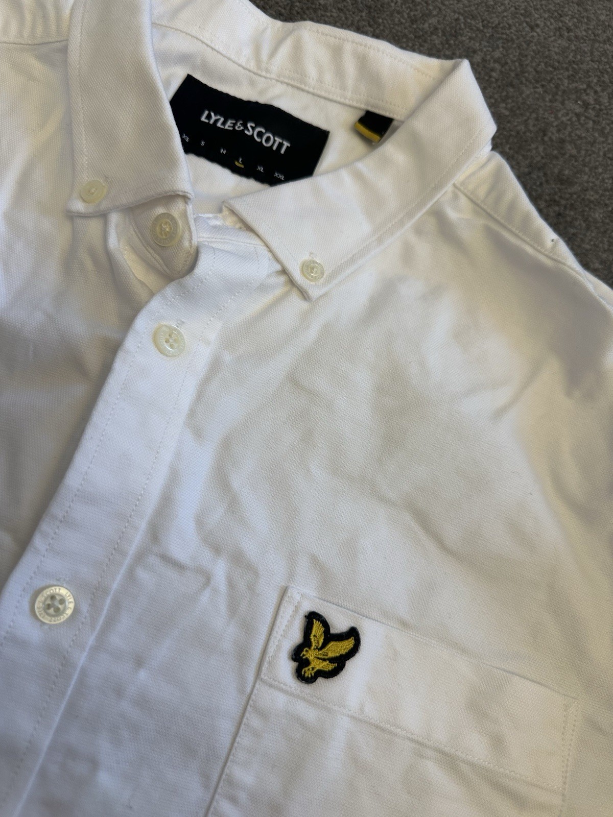 Condition: Excellent condition, worn once only. No stains or damage. Freshly washed – just needs ironing. Genuine Lyle & Scott white long sleeve Oxford shirt with button-down collar and embroidered gold eagle logo. Classic smart/casual everyday style. Size: Large Material: 100% Cotton Colour: White