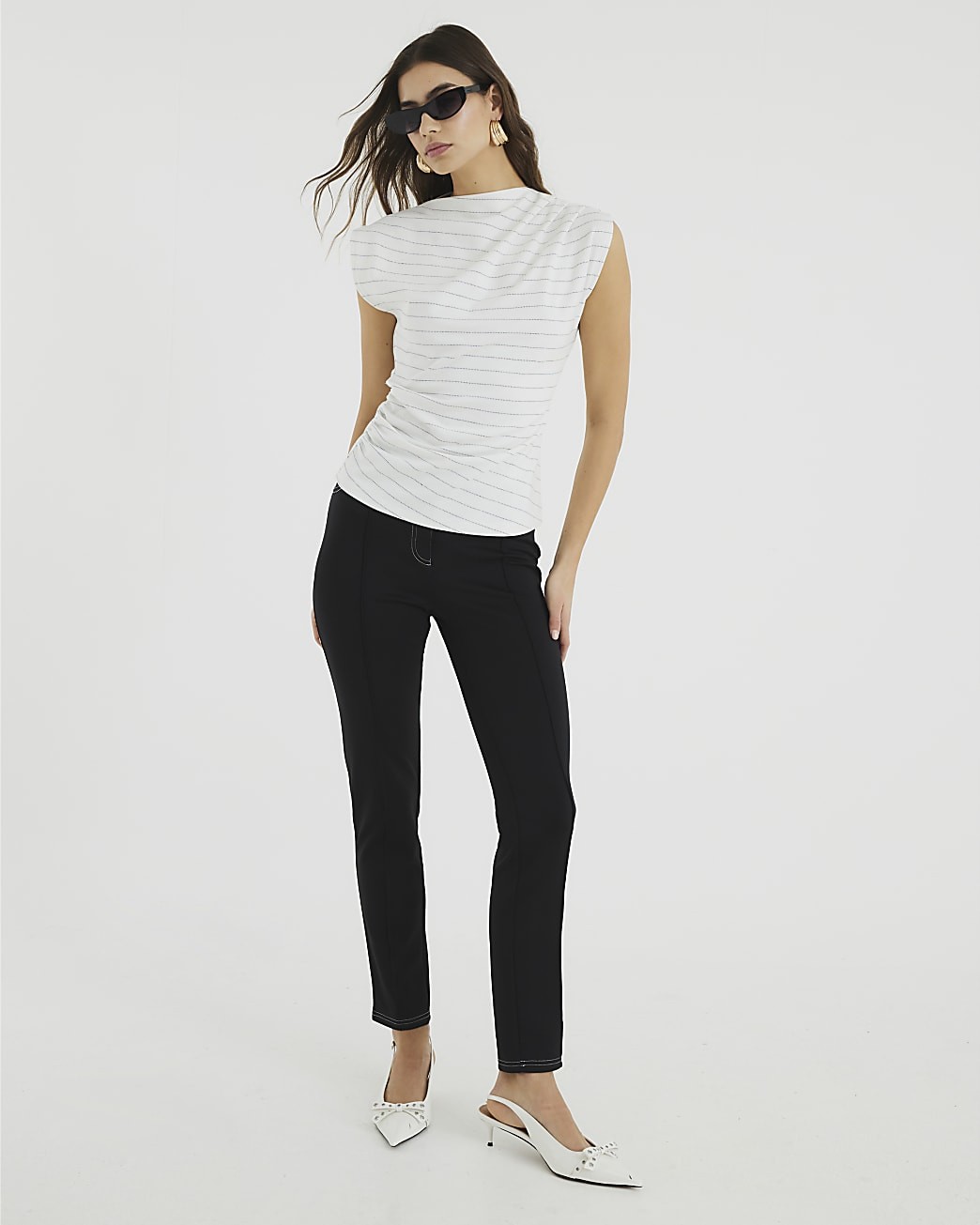 River Island Womens Peplum Top Cream Striped Knit Belted Short Sleeve Blouse